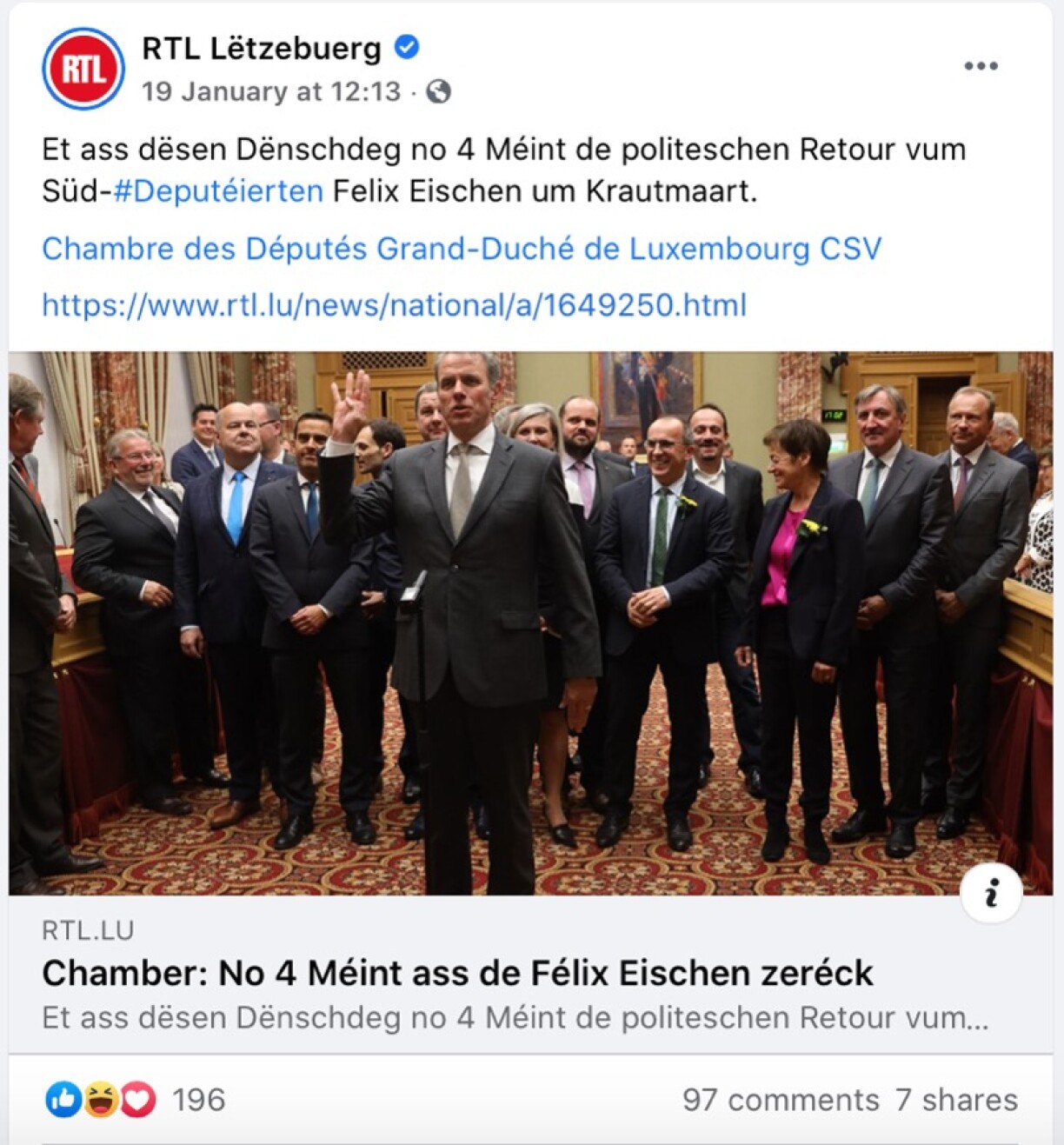 Et ass ee Beispill, wéi een se heefeg op de soziale Medie begéint : Den 19. Januar deelt RTL Lëtzebuerg op hirer Facebooksäit d’Noriicht, dat de Felix Eischen no véier Méint seng Aarbecht als Deputéierten nees ophëlt. Dës Nouvelle ass illustréiert mat enger Foto op där den Här Eischen virun enger ganzer Rei Deputéierte steet. Esouwäit, esougutt. Dëst huet allerdéngs ganz séier vill Facebooknotzer op de Plang geruff, déi sech doriwwer echaufféieren, dat op dësem Bild keen eng Mask dréit respektiv d’Distanciatiounsregelen net agehale ginn.