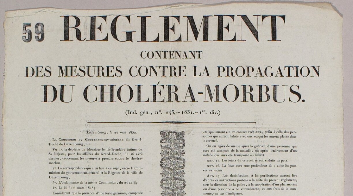 So oder so ähnlich könnte in einigen Jahrzehnten in den Geschichtsbüchern die gegenwärtige Ausbreitung des COVID-19 in Luxemburg beschrieben werden. Doch stammt diese Beschreibung keineswegs aus der imaginierten Zukunft: Sinngemäß hat sie der Luxemburger Biologe und Medizinhistoriker Jos. A. Massard 2004 in Bezug auf die Ausbreitung der zweiten großen Cholerapandemie von 1826–1841 formuliert.[1] Nachdem 1832 der epochale Ausbruch der Cholera auch Luxemburg erreichte, erlagen der Krankheit allein in Luxemburg-Stadt schon bald 215 Einwohner sowie 57 Soldaten der preußischen Garnison. Seuchen sind also in Luxemburg nichts Neues.