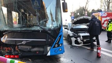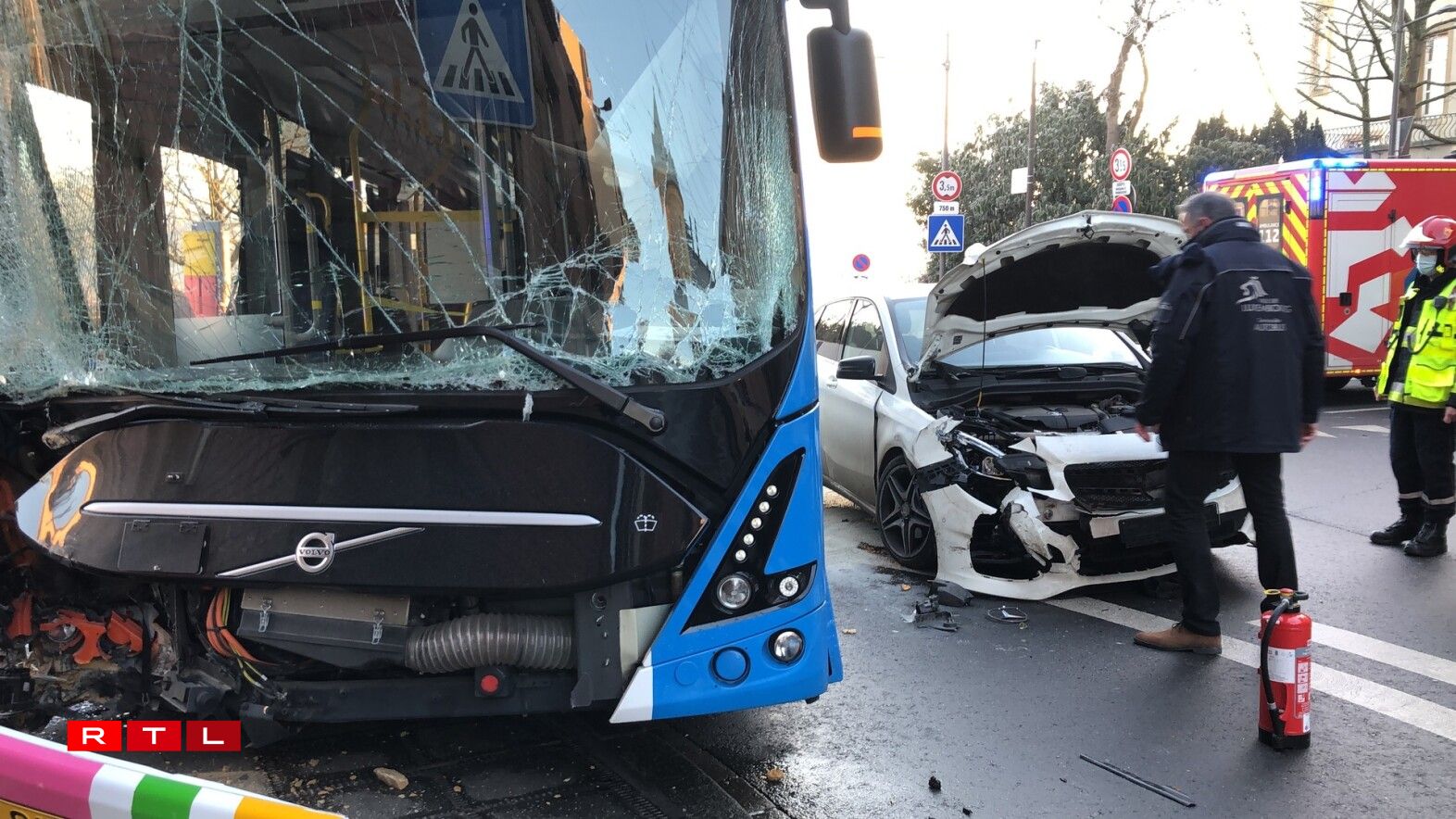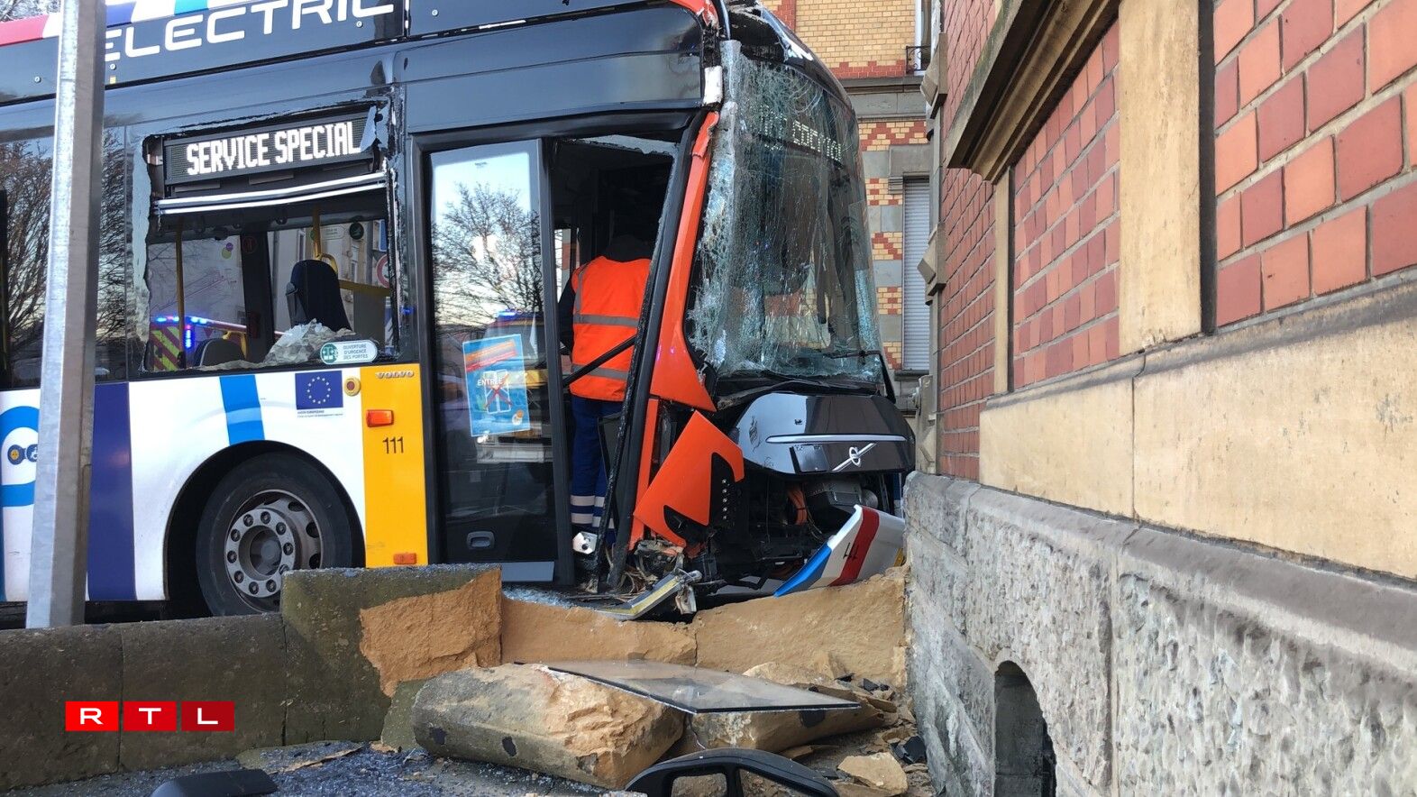 De Bus ass beim Accident géint 8.20 Auer um Eck vun der Route Côte d’Eich an der Rue Willy Goergen an d’Fassade vun engem Gebai gerannt. 10 Leit sinn dobäi blesséiert ginn. De Buschauffer an aacht Passagéier, genee ewéi de Chauffeur vum Auto, goufe fir eng Kontroll an d’Spidol bruecht. Ee Samu an véier Ambulanze waren op der Plaz.
