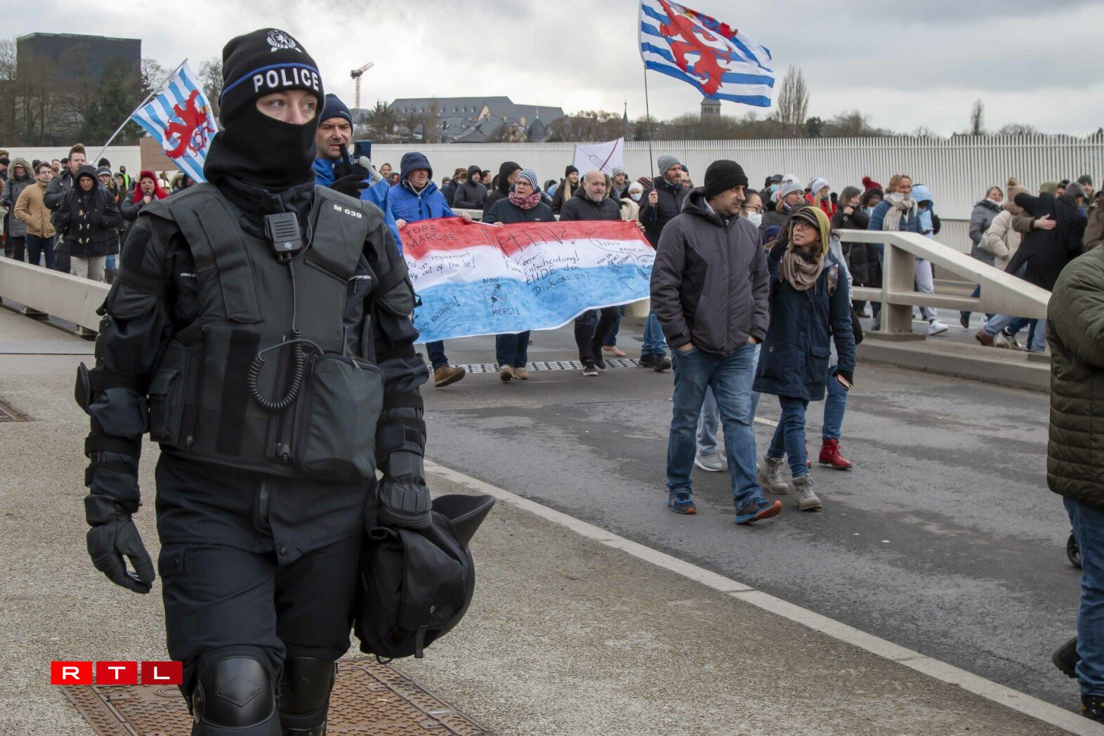 Comme annoncé, la Police a été présente ce samedi 5 février 2022 à Luxembourg-Ville afin d’encadrer d’une part les deux manifestations officiellement autorisées dans le zoning prévu entre le Glacis et la Place de l’Europe et d’autre part de pouvoir intervenir en cas de rassemblements non autorisés respectivement en cas de troubles à l’ordre public.