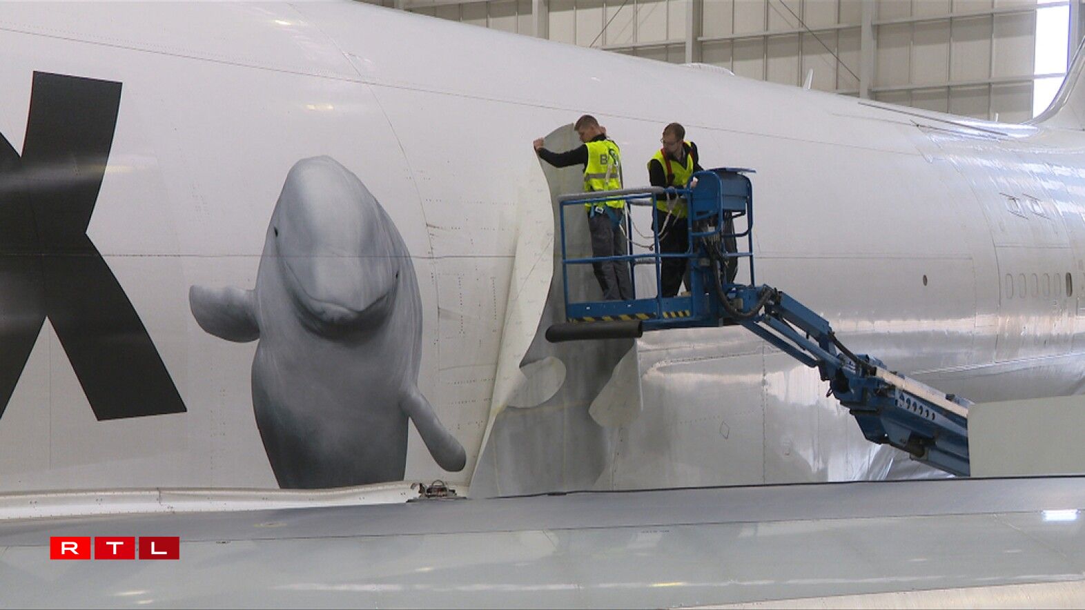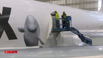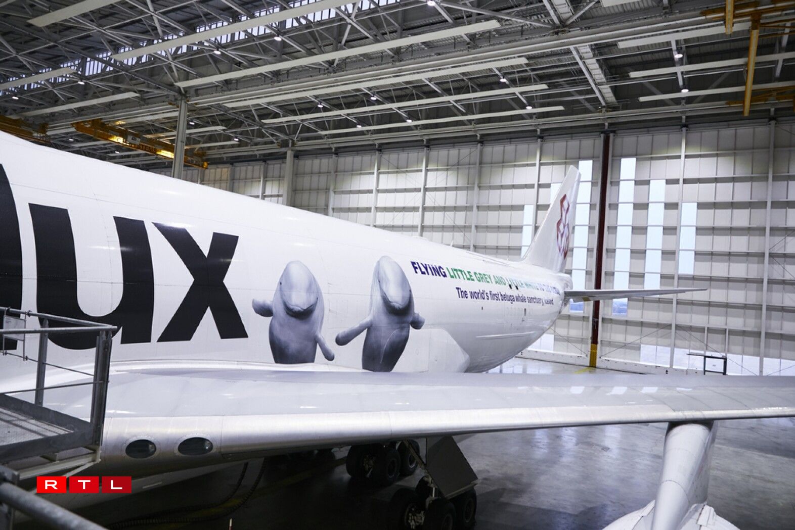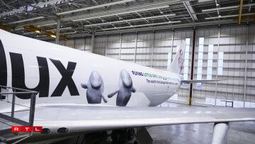 E méi speziellen Design huet eng 747-400 vun der Cargolux. Hei gëtt d’Partenariat mat Sea Life Trust an dem Whale and Dolfin Conservation promouvéiert. Ma net nëmmen dat.
