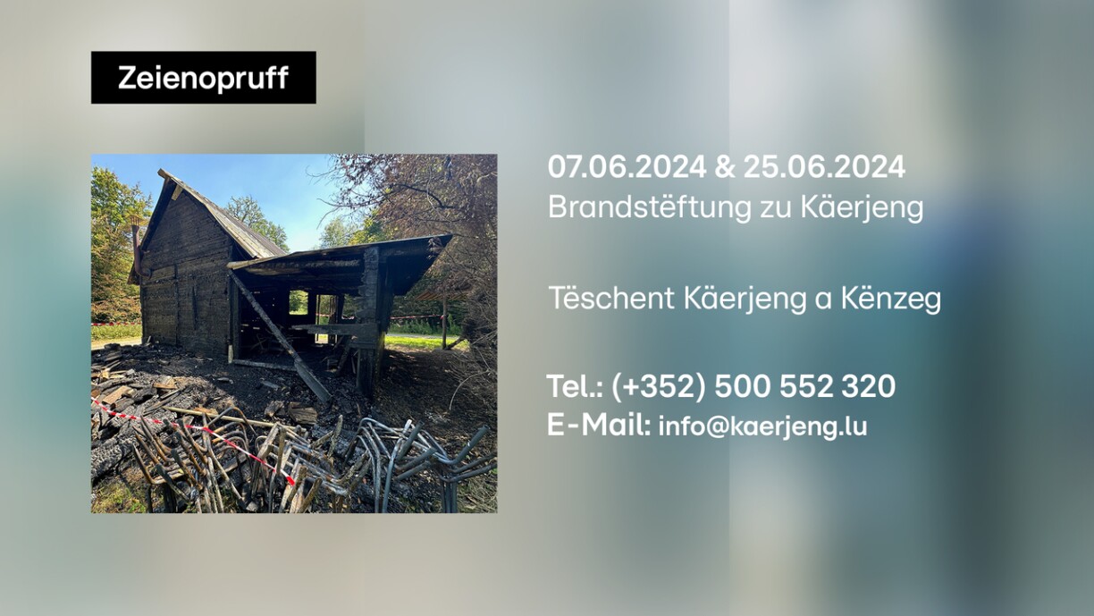 Jiddereen, deen eppes gesinn huet, soll sech bei der Käerjenger Gemeng mellen. Entweder per E-Mail op info@kaerjeng.lu oder op der Nummer 500 552 320.