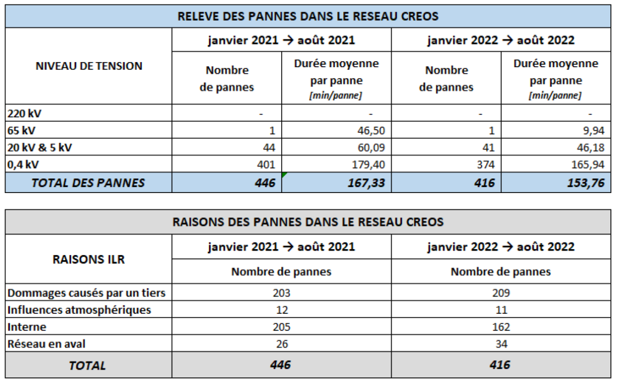 Vu Januar 2021 bis August 2021 gouf et 446 Stroumpannen, déi am Schnëtt 167,33 Minutte gedauert hunn, esou den Energieminister Claude Turmes. Am selwechten Zäitraum 2022 ass d’Zuel vun de Pannen op 416 erofgaangen an och d’Dauer goung op 153,76 Minutte/Pann erof.