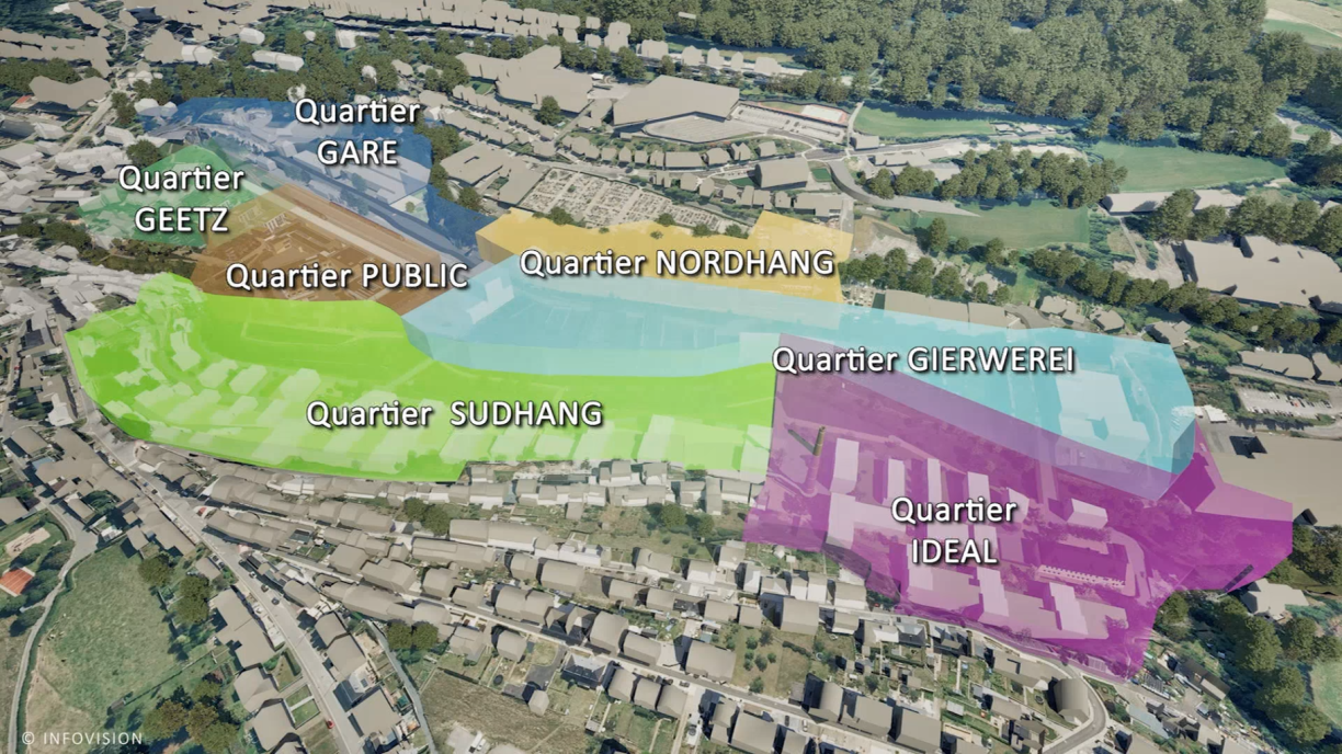Enn 2009 sinn déi éischt Etüde fir de Mammutprojet op 34 Hektar ugelaf, 2038 da soll de Quartier mat sengen 1.085 Wunnenge stoen. 70 Prozent gi verlount, 30 ginn an d’Vente. Definitiv Präisser ginn et nach net. De Projet ass opgedeelt op 7 Deel-Bebauungspläng an e steet am Zeeche vun der Nohaltegkeet.