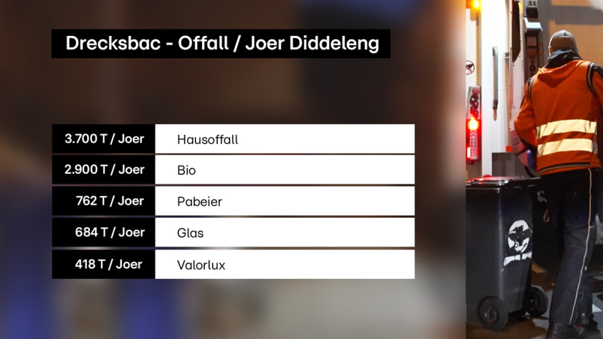 Den Hausoffall fält mat 3.700 Tonne pro Joer zu Diddeleng am meeschten an d’Gewiicht. Mat 418 Tonnen d’Joer maachen d’Valorlux-Tuten am mannsten aus.