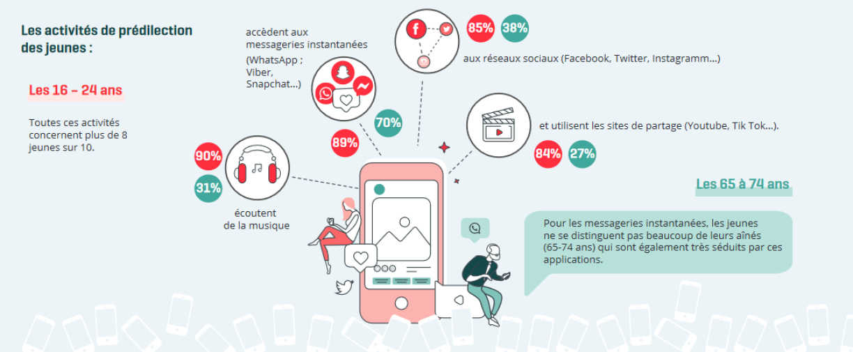 85% vun de Jonken tëscht 16 a 24 Joer notzt de Smartphone fir sozial Medie wéi Facebook, Twitter an Instagram géint nëmmen 38% bei de 65 bis 74 Joer ale Lëtzebuerger. 89% ginn iwwert den Handy op Messengerdéngschter wéi WhatsApp, Viber oder Snapchat, hei gëtt et keen all ze groussen Ënnerscheed zu der méi eelerer Generatioun mat 70%, déi Noriichten iwwer esou Déngschter verschécken a kréien. Musek iwwert den Handy lauschteren 90% vun de Jonke par Rapport zu 31% vun de 65 bis 75 Joer alen Awunner. Bei Plattforme wéi YouTube oder TikTok läit déi méi jonk Generatioun mat 84% kloer iwwert de 27% bei der eelerer Generatioun.