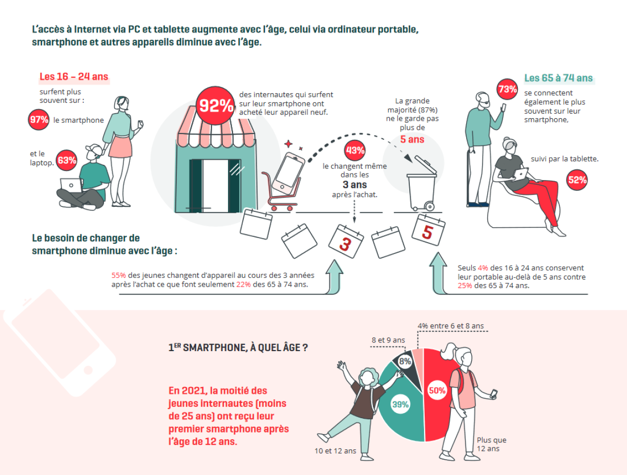 Ma den Accès iwwer Computer oder Tablet notzt éischter déi méi al Generatioun tëscht 65 a 74 Joer (52%), trotzdeem geet hei de Gros (73%) iwwert de Smartphone online. D'16 bis 24 Joer al Awunner ginn och léiwer iwwert den Handy an den Internet (97%) an 63% notzen dofir de Laptop.