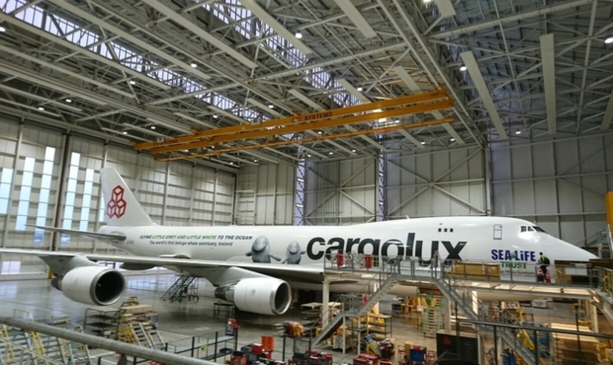 E méi speziellen Design huet eng 747-400 vun der Cargolux. Hei gëtt d’Partenariat mat Sea Life Trust an dem Whale and Dolfin Conservation promouvéiert. Ma net nëmmen dat.