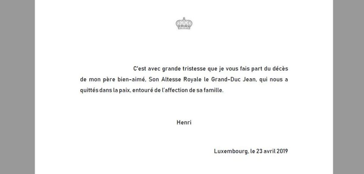 Haut ass déi traureg Nouvelle komm, dass de Grand-Duc Jean am Alter vun 98 Joer gestuerwen ass.
