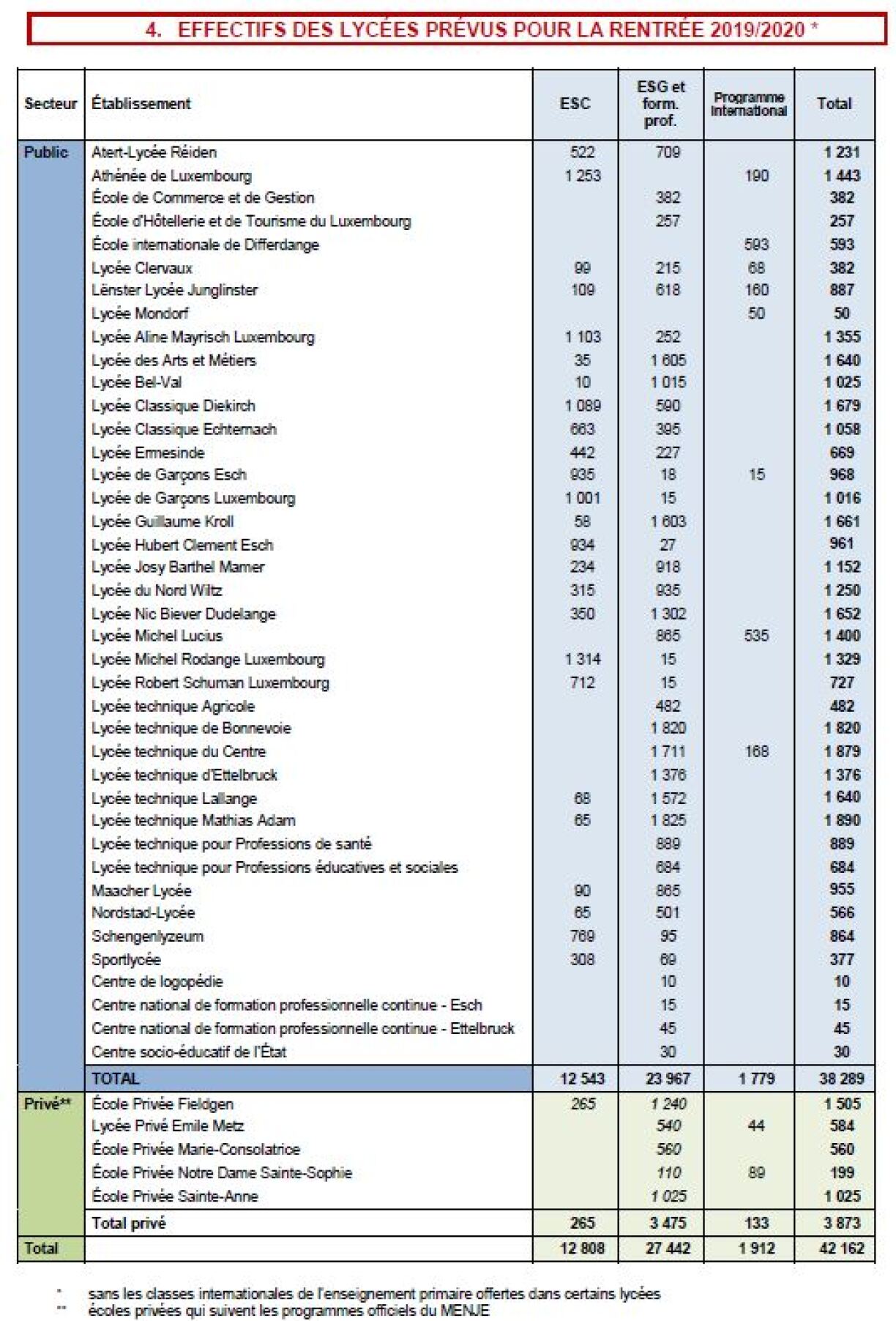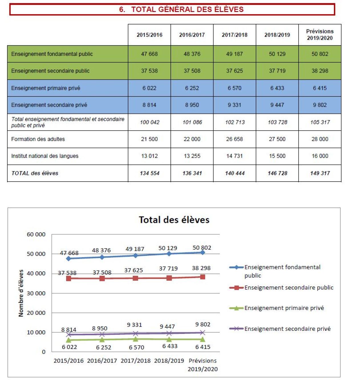 Am Ganze ginn et iwwer 149'000 Schüler zu Lëtzebuerg, do sinn och d’Erwuessenebildung (28'000) an d’Sproochecoursen um INL, dem Institut national des langues, (16'000) derbäi. Iwwer 16'000 Schüler ginn op eng Privatschoul hei am Land.