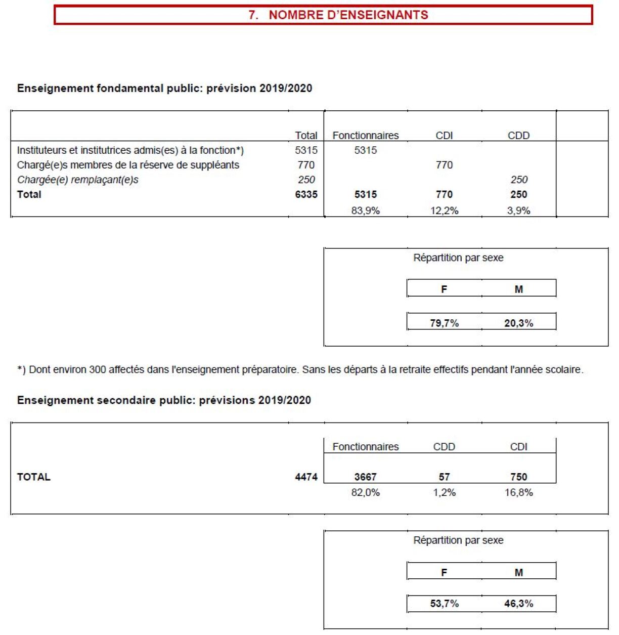 Am Fondamental an am Secondaire gi fir dat neit Schouljoer iwwer 10'800 Enseignante gebraucht, méi wéi 6'300 fir d’Grondschoul. Do dominéiere kloer d’Léierinne mat bal 80%, d’Schoulmeeschtere maache just 20% aus. Am Lycée ass d’Situatioun méi ausgeglach, och wann hei déi weiblech Proffe mat knapp 54% dominéieren.
