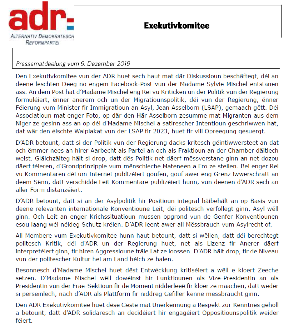Am Communiqué vun der ADR heescht et wuertwiertlech: „datt weder si perséinlech, nach d’ADR als Plattform fir niddreg Gefiller kënne mëssbraucht ginn“.