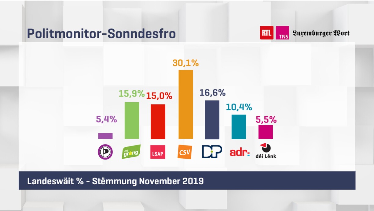 Wann e Sonndeg géif gewielt ginn, géif eng CSV a Prozenter zwar e bësse gewannen a léich bei 30,1 Prozent. Wéinst dem komplizéierte Walsystem mat de Reschtsëtz géif déi gréisst Oppositiounspartei awer nach emol 1 Sëtz verléieren a vun 21 op 20 Sëtz erofrutschen. Och mam neie Parteipresident Frank Engel hätt d’CSV den Negativtrend deemno net bremse kënnen.