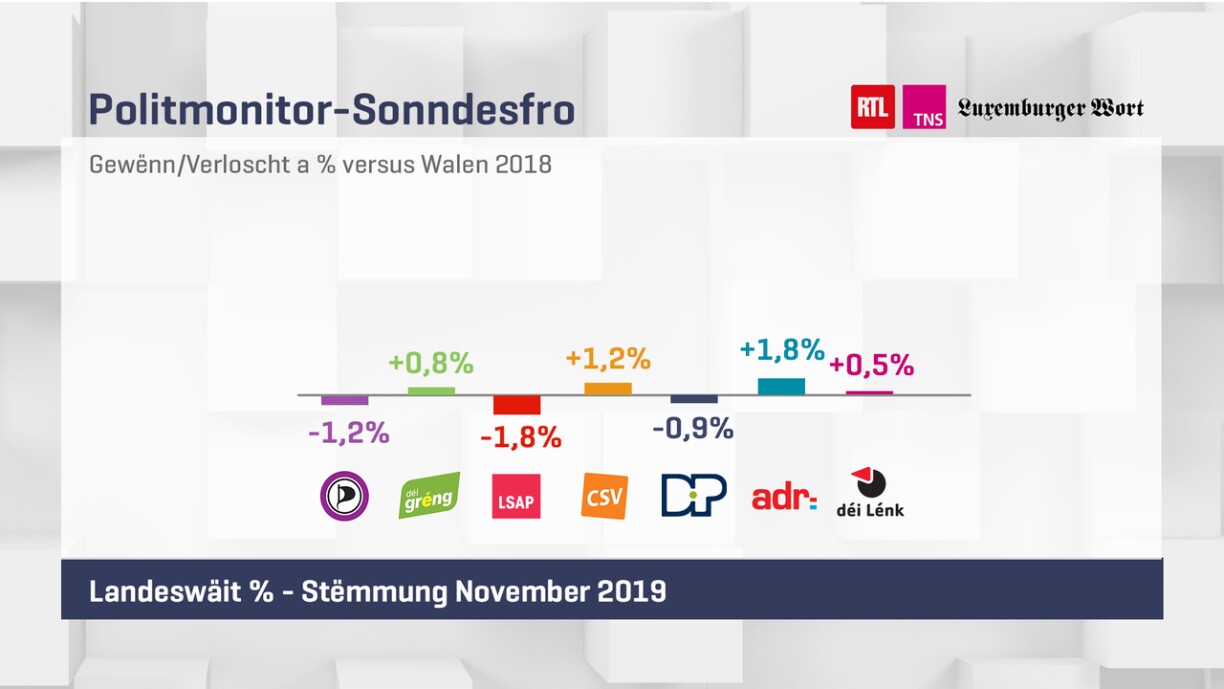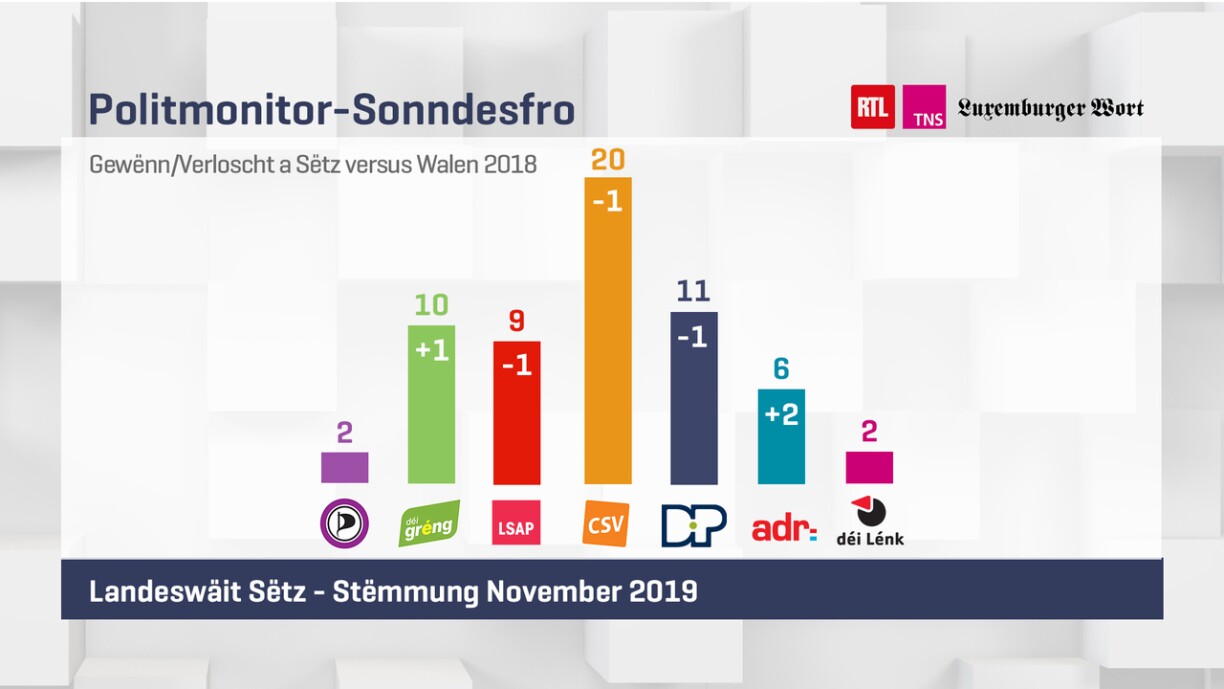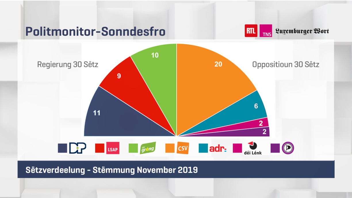 Schlecht gesäit et dogéint fir d’Sozialisten aus. Si géifen ee Sëtz verléieren, grad ewéi d’DP. D’LSAP hätt domat just nach 9 Sëtz, d’Demokraten der 11.
