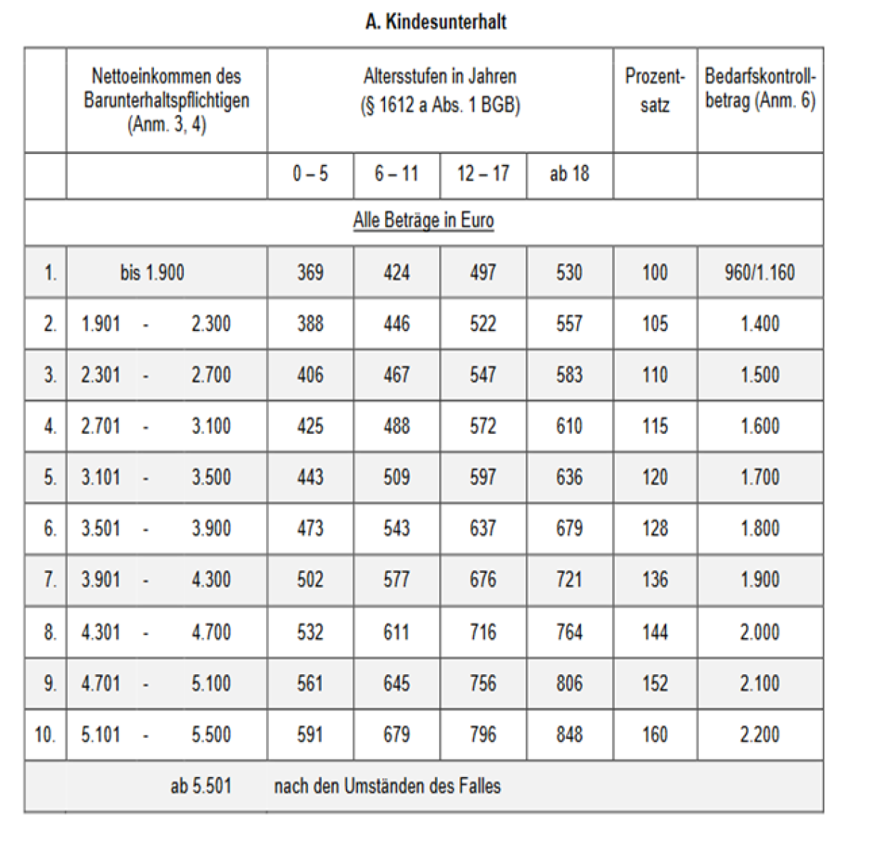 An Däitschland ass et d’"Düsseldorfer Tabelle” no där sech fir d’Festleeë vun den Alimenter geriicht gëtt. Hei spillt engersäits d’Akommes vun der Persoun déi den Ënnerhalt bezuele muss eng Roll. Dann awer och den Alter vum Kand. An et ass e Montant festgeluecht, deen dësen Elterendeel muss iwwreg behale fir ze liewen. Eng Tabell, déi och d’Aarbecht vun den Affekoten extrem erliichtere géif. An der Theorie op mannst.