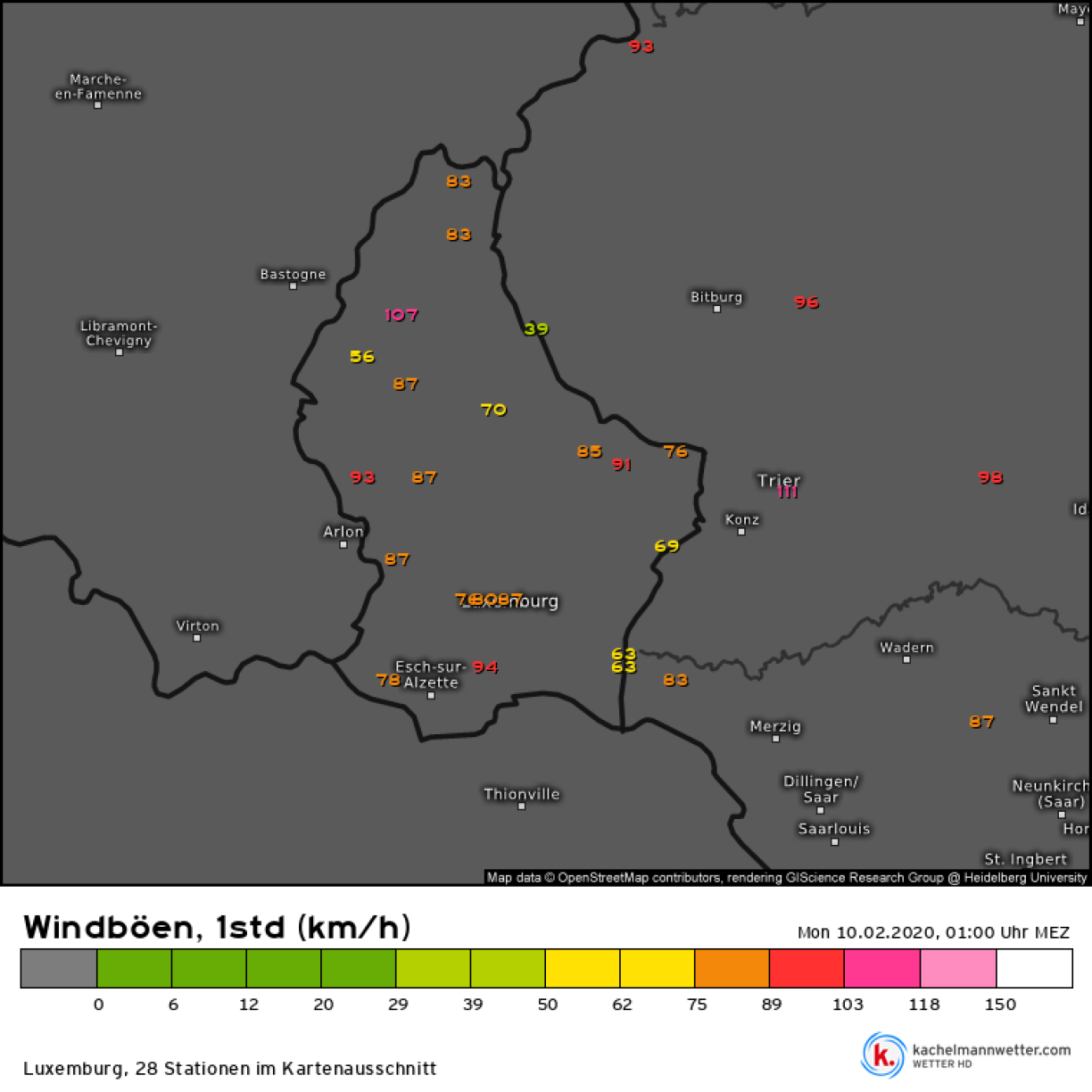 Meteolux huet eng Alerte Orange wéinst Stuerm erausgi fir e Sonndeg vun 13 Auer bis an d’Nuecht eran. An der Nuecht op e Méindeg um 1 Auer gëtt et dann eng Alerte Rouge, déi bis moies 9 Auer geet.