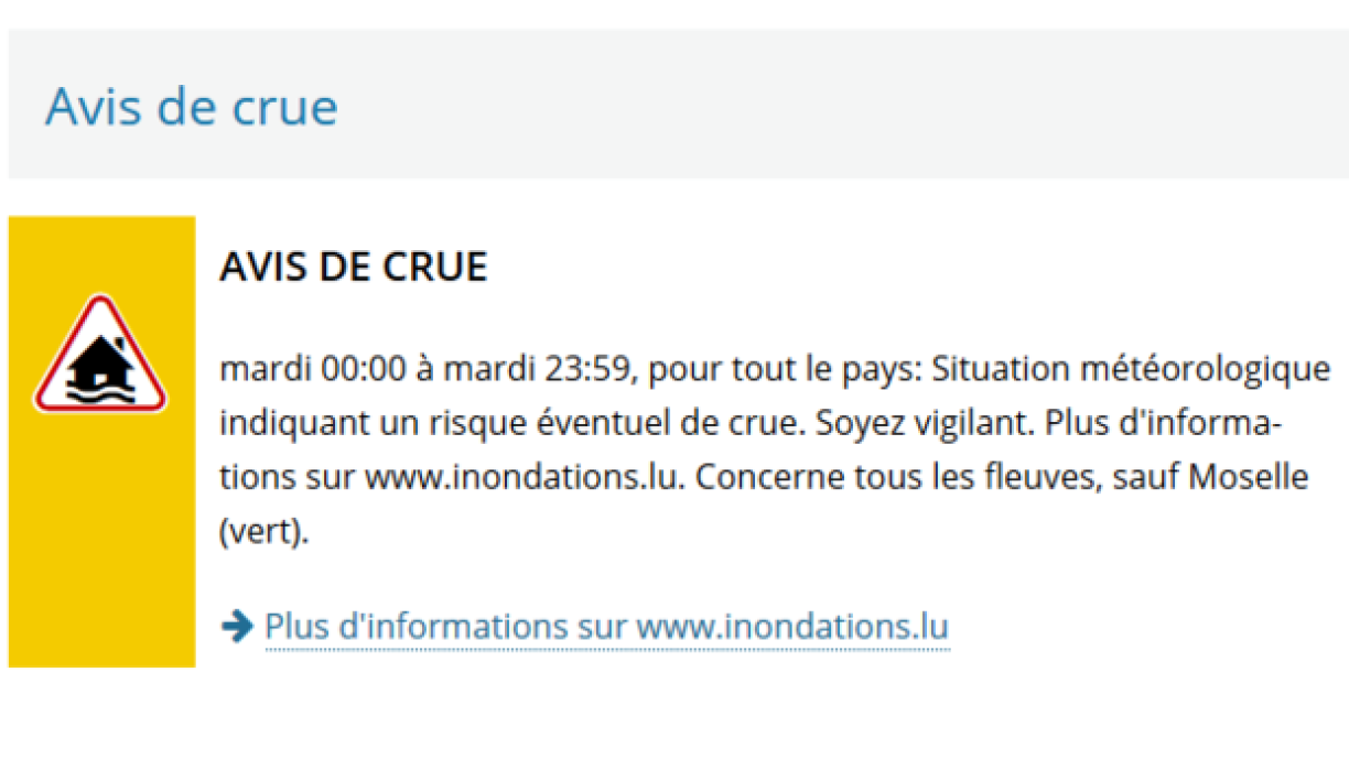 Meteolux huet um Dënschdeg de Moien eng Alerte jaune erausginn wéinst de Waasserpeegelen. Den Ëmweltministère mellt, dass d’Peegelen tendenziell nees um Fale sinn.