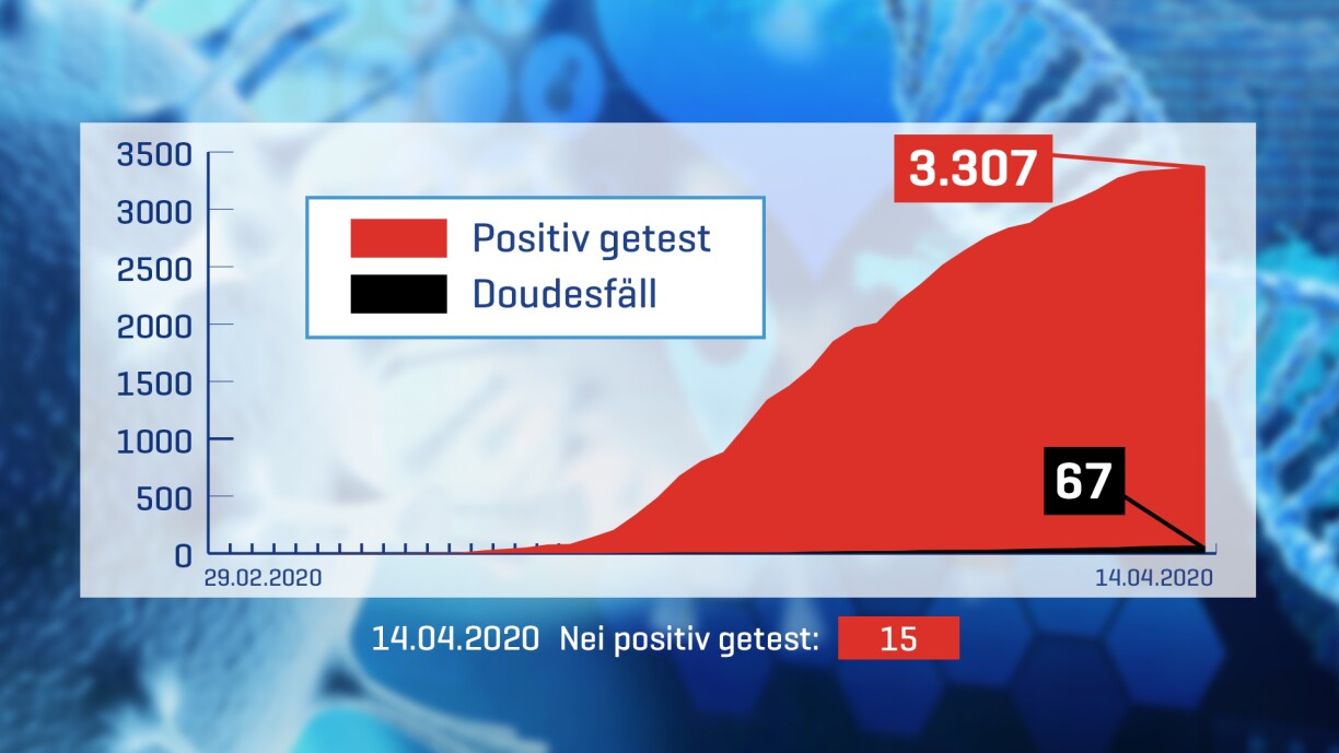 Bei den Infektiounen ass et eng Hausse vu 15 positiv geteste Patienten zënter e Méindeg. Dat sinn der elo am Ganzen 3.307.