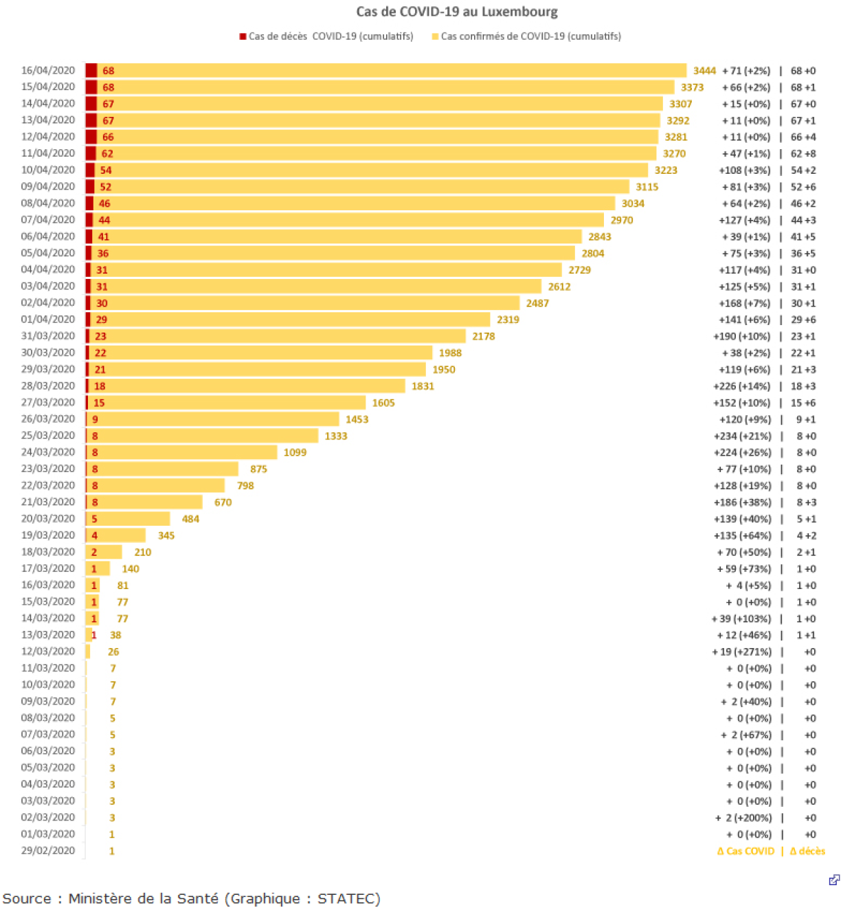 Après une vérification des chiffres, le ministère de la Santé informe que le nombre de décès a été revu à la baisse. Un décès annoncé le 15 avril a été attribué au Covid-19 par erreur. Le nombre de décès suite au Covid-19 s’élève donc à 68 à la date du 16 avril 2020.