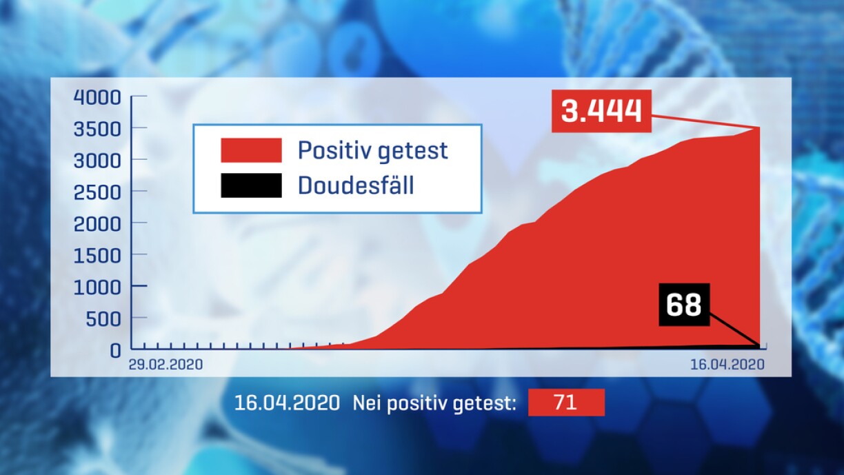 D’Altersmediane läit bei 85 Joer. Bei den Infektiounen ass et eng Hausse vu 71 positiv geteste Patienten zënter e Mëttwoch. Dat sinn der elo am Ganzen 3.444.
