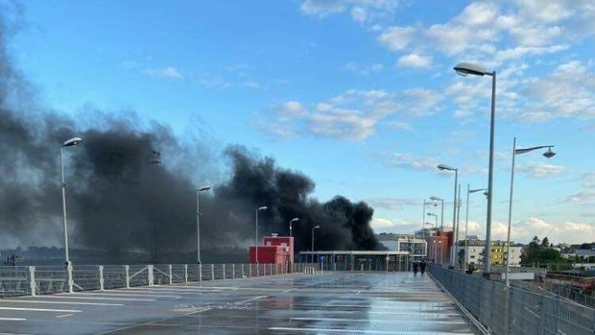 E Freideg den Owend hat Material aus Kautschuk an enger Garage ënnert der Bréck Feier gefaangen an hat fir zolitte schwaarzen Damp gesuergt.