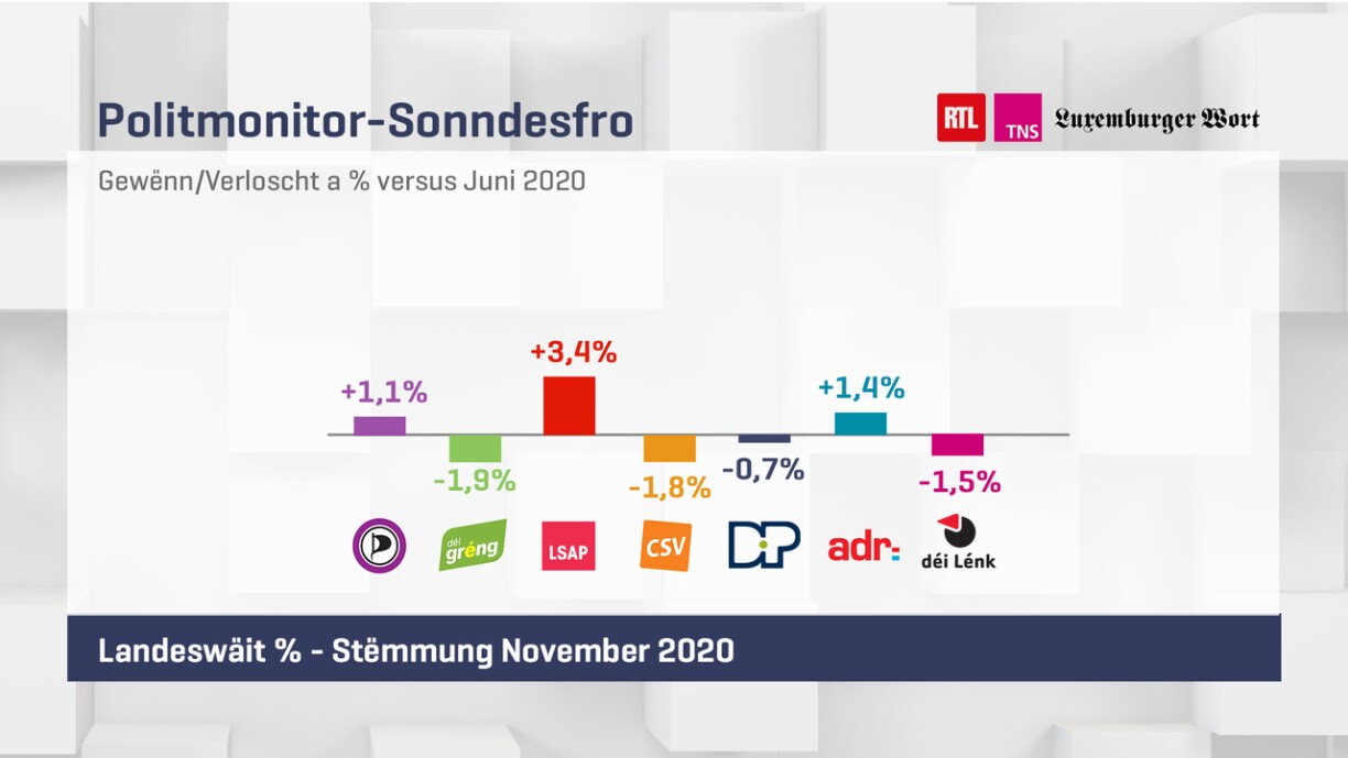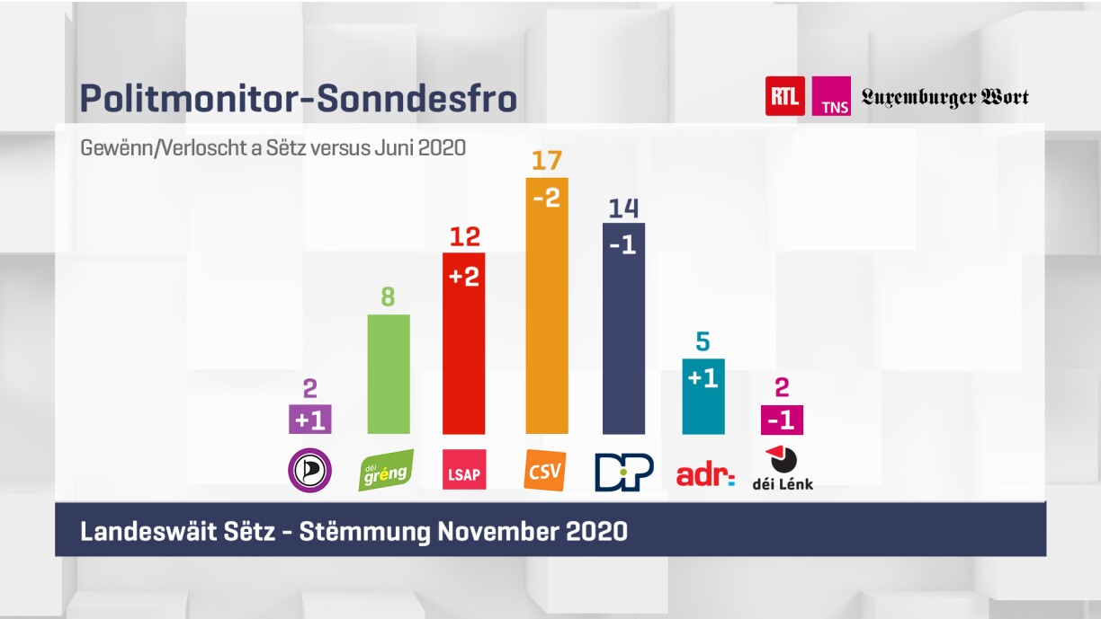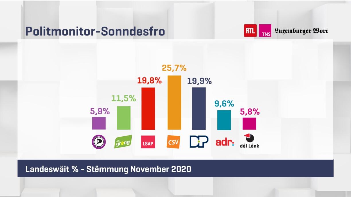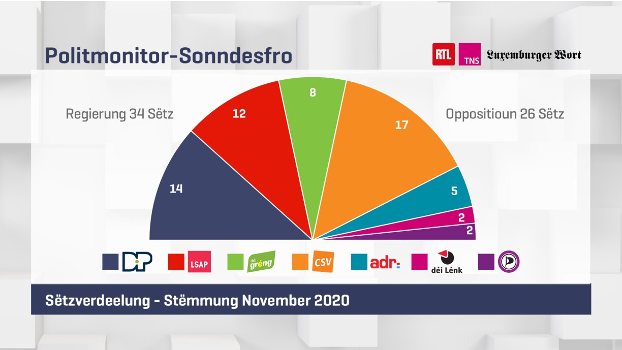 De leschte Politmonitor vun TNS-Ilres, am Optrag vun RTL an dem Lëtzebuerger Wort, huet nämlech erginn, dass d’Majoritéitsparteien zesummen 3 Sëtz méi am Parlament géife gewannen, wéi bei de leschte Walen. An dat well déi gréissten Oppositiounspartei, d’CSV, ëmmer nach weider u Stëmme verléiert.