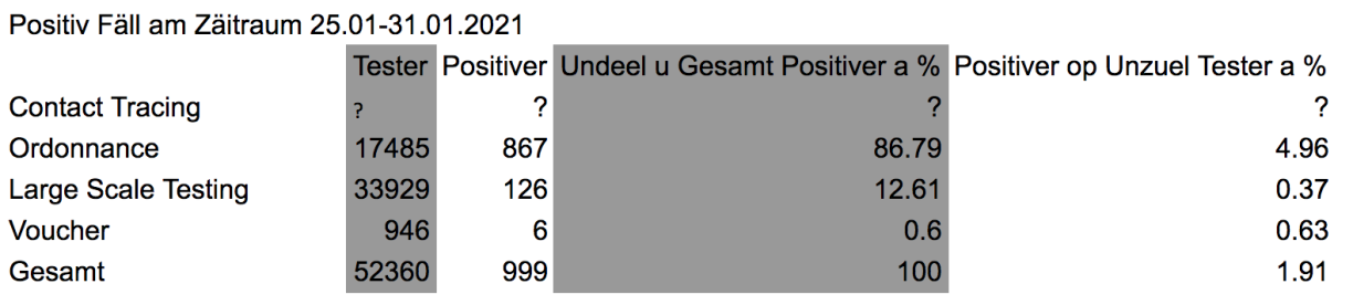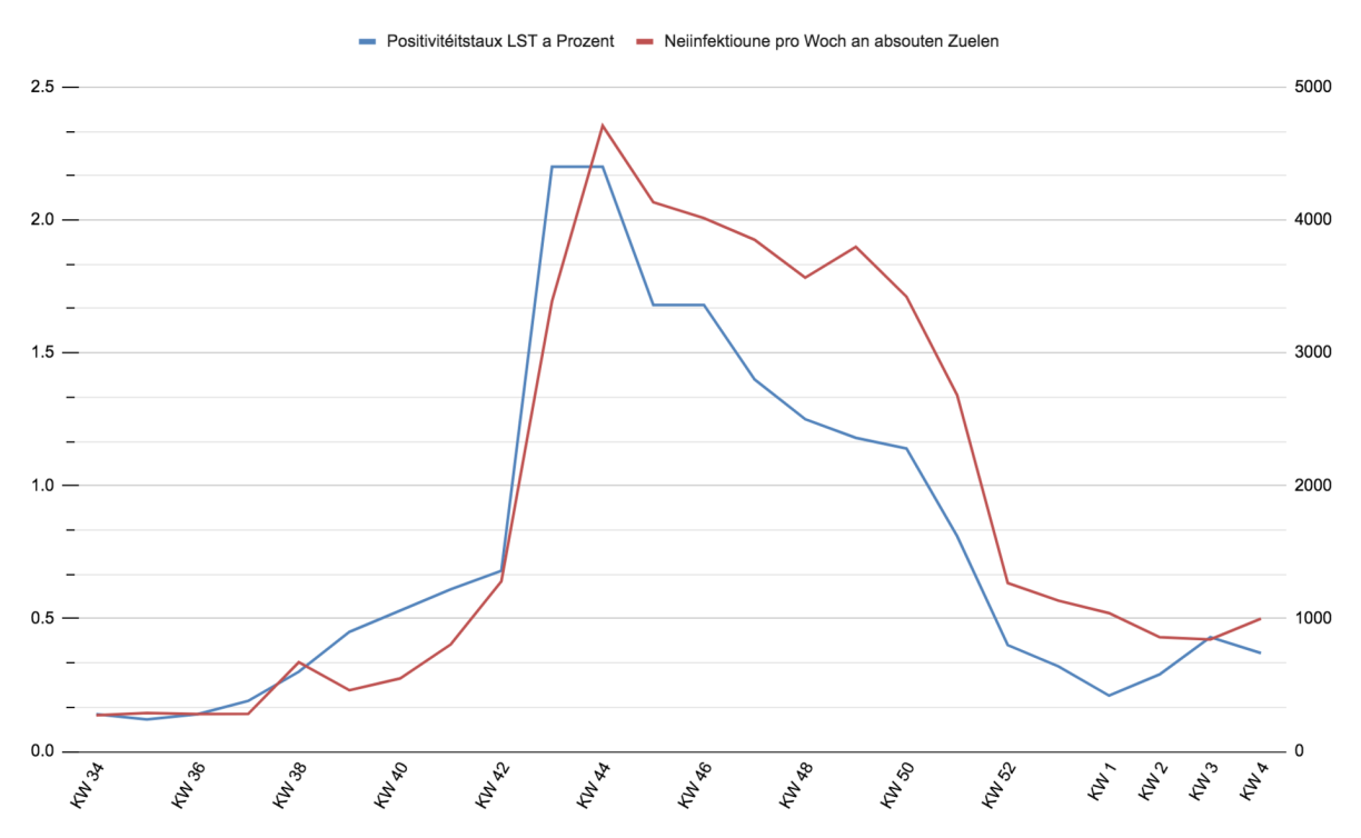 De Positivitéitstaux am Large Scale Testing ass nees liicht zréckgaangen op elo 0.37 Prozent, an der Woch vum 18. bis 24. Januar louch den Taux bei 0.43 Prozent.