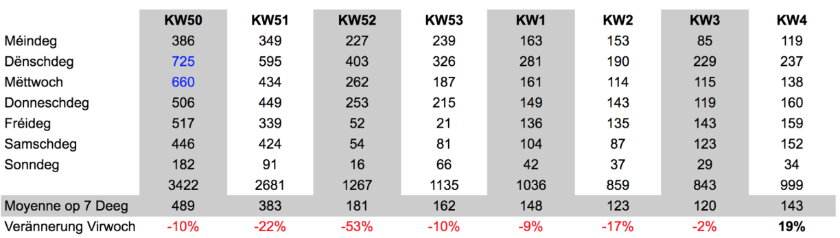 An der Moyenne op d’Woch gekuckt hu sech 143 Persounen den Dag infizéiert. 18 Mënsche sinn d’lescht Woch un de Suitte vun enger Sars-CoV2-Infektioun gestuerwen.