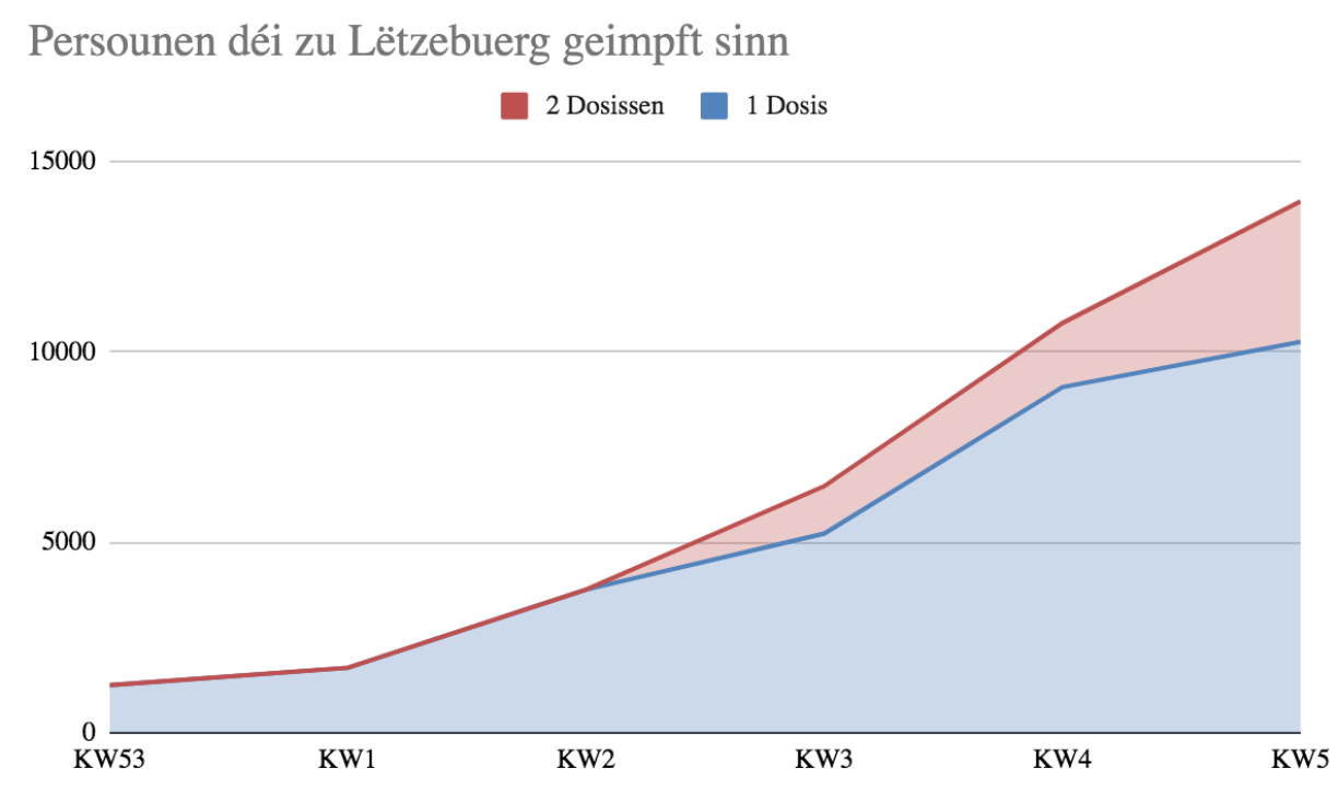 Knapp 14.000 Persoune goufe bis ewell zu Lëtzebuerg geimpft. 10.252 Persoune kruten eng éischt Dosis; 3.688 krute mëttlerweil eng 2 Impfdosissen.
