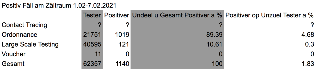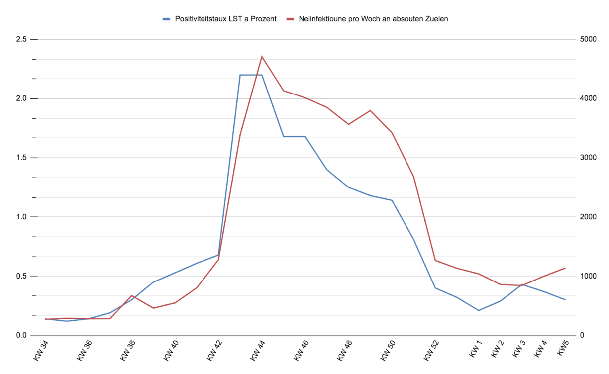 De Positivitéitstaux am Large Scale Testing ass déi zweet Woch hannereneen nees liicht zréckgaangen op elo 0.3 Prozent, an der Woch vum 25. bis 31. Januar louch den Taux bei 0.37 Prozent.