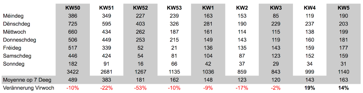 An der Moyenne op d’Woch gekuckt hu sech 163 Persounen den Dag infizéiert. 13 Mënsche sinn d’lescht Woch un de Suitte vun enger Sars-CoV2-Infektioun gestuerwen.