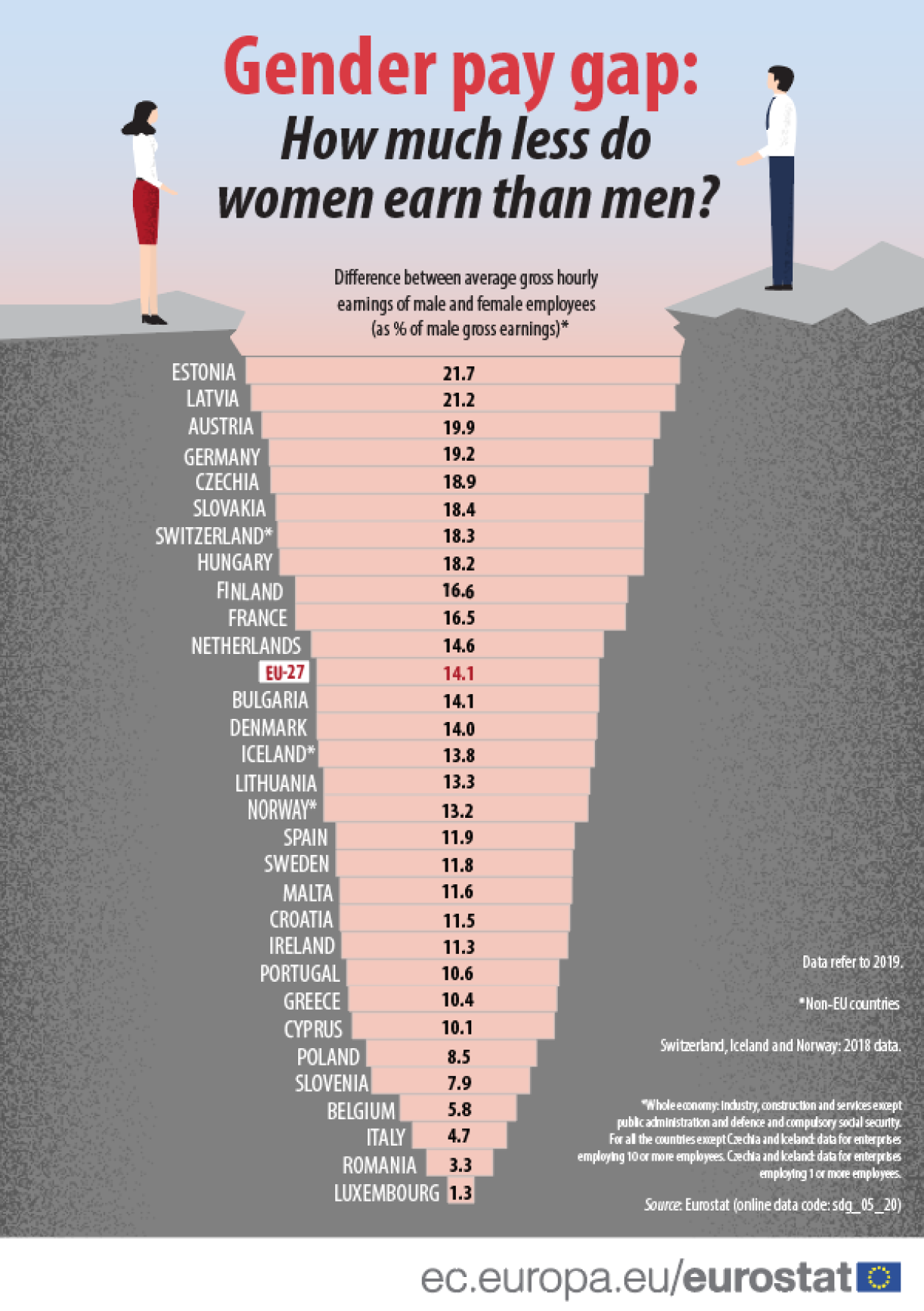 Passend zum Weltfraendag huet Eurostat e puer Statistiken iwwert beruffstäteg Fraen an Europa verëffentlecht. Mat Bléck op déi sougenannten “Gender Pay Gap” koum eraus, dass 2019 de Bruttostonneloun bei Fraen an der Moyenne 14,1% ënnert deem vun de Männer louch. Am héchste war den Ënnerscheed virzejoert an Estland (21,7%), Lettland (21,2%), Éisträich (19,9%) an Däitschland (19,2%). Am niddregste war d’Differenz Eurostat no zu Lëtzebuerg mat 1,3%. Direkt virdru koume Rumänien mat 3,3%, Italien mat 4,7% an d’Belsch mat 5,8%.