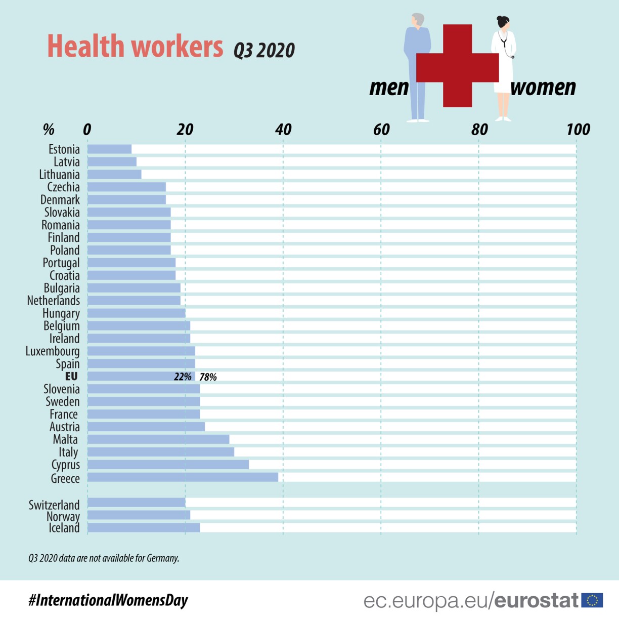 D’Gesondheetswiesen ass e Beräich, dee staark vu Fraen dominéiert gëtt. Vun alle Funktioune goufen der zejoert 78% vu Fraen ausgeüübt. An Estland a Litauen war 2020 esouguer iwwer 90% vum ganze Gesondheetspersonal weiblech, a Griicheland dogéint 61%. 12% vun alle beruffstätege Fraen an der EU hunn iwwerdeems d’lescht Joer am Gesondheetssecteur geschafft.