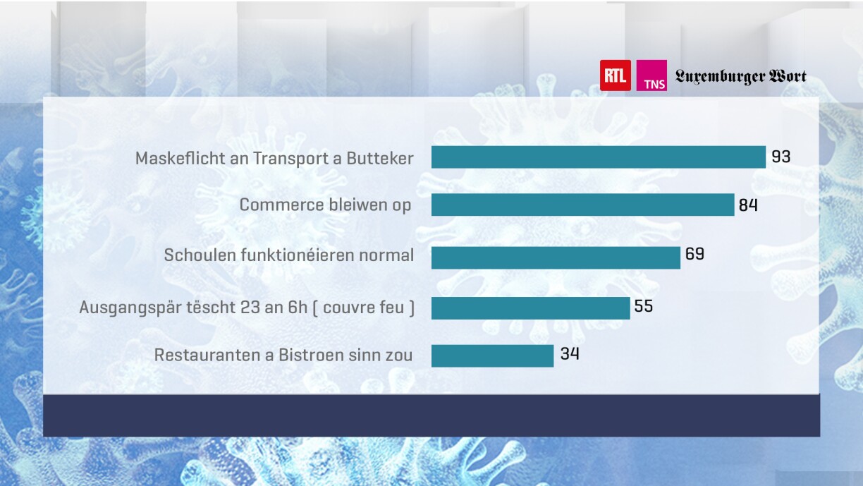 Wat d’Mesuren ugeet, do gëtt et mat 93% eng grouss Akzeptanz fir d’Maskenobligatioun am Commerce an am ëffentlechen Transport.