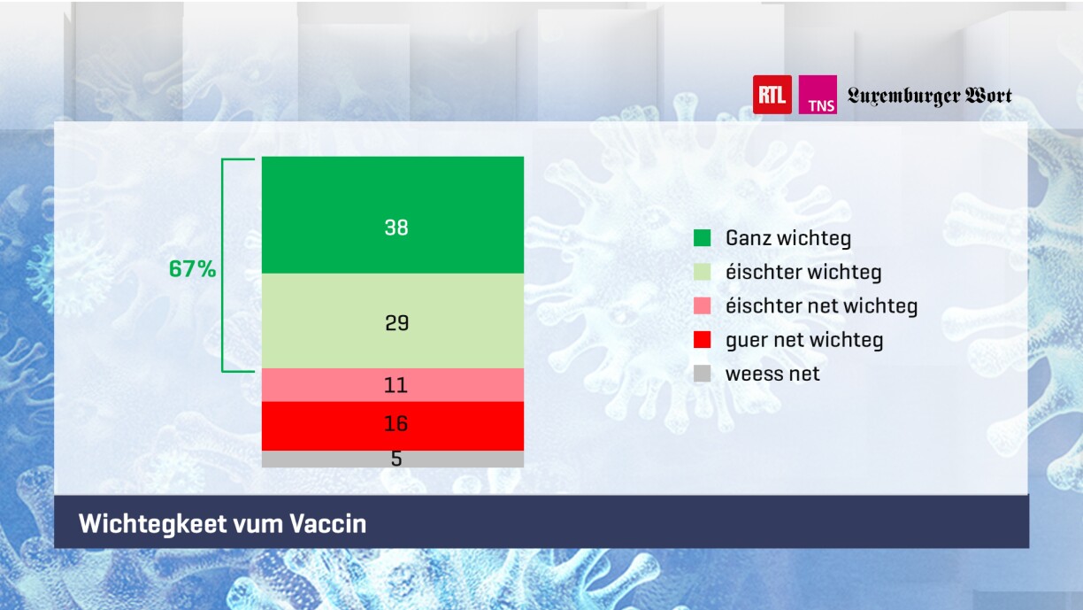 10% vun de befrote Persoune sinn iwwerdeems strikt géint eng Impfung. Weider 9% soten, si wieren och éischter negativ agestallt.