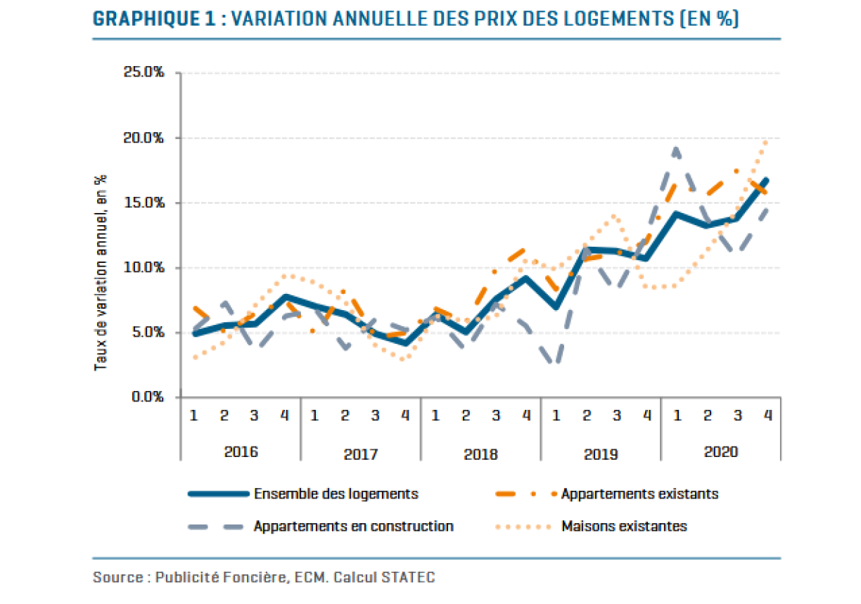 Ëm ganzer 16,7% sinn d’Präisser fir Appartementer an Haiser par rapport zum 4. Trimester 2019 geklommen. Do louch déi duerchschnëttlech Hausse pro Joer nach bei 10,1%, an am Joer 2018 waren d’Präisser ëm 7,1% an d’Luucht gaangen, 2017 waren et 5,6% an 2016 6%.