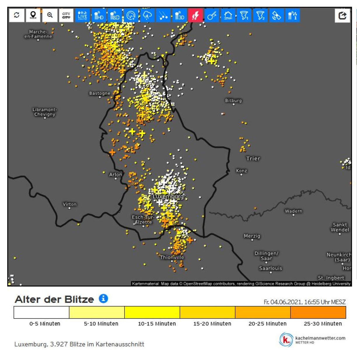 Op Kachelmannwetter.lu goufe bis 17 Auer iwwer 4.200 Blëtzer gezielt.