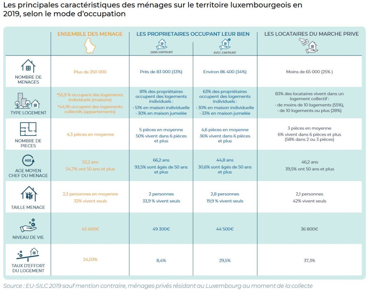 Les loyers et les prix de vente des biens immobiliers ne cessent de progresser au Luxembourg. Cette croissance a un impact direct sur les ménages, et particulièrement pour les locataires du marché privé et les propriétaires ayant encore un emprunt à rembourser. Pour eux, tous les ans le coût du logement pèse de plus en plus lourdement dans le budget. Le taux d’effort mesure le poids du coût total du logement des ménages dans le revenu disponible. Il a été utilisé ici pour décrire et comparer l’impact du coût du logement supporté par les ménages sur la période 2016-2019.