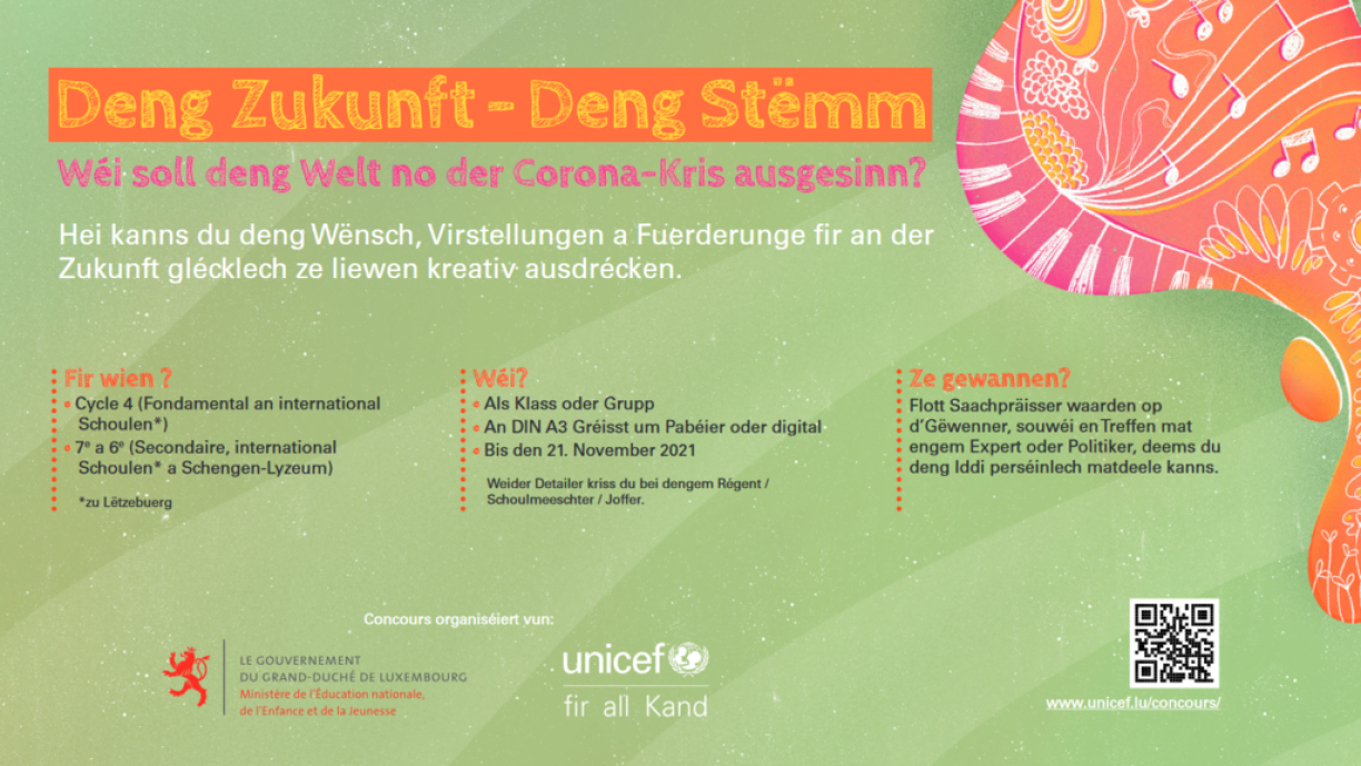 Am Kader vum Weltkannerdag 2021, den 20. November, organiséieren de Service des droits de l'enfant vum Educatiounsministère an d'Unicef e Concours mam Numm "Deng Zukunft. Deng Stëmm." ronderëm d'Thema: Wéi soll deng Welt no der Corona-Kris ausgesinn?