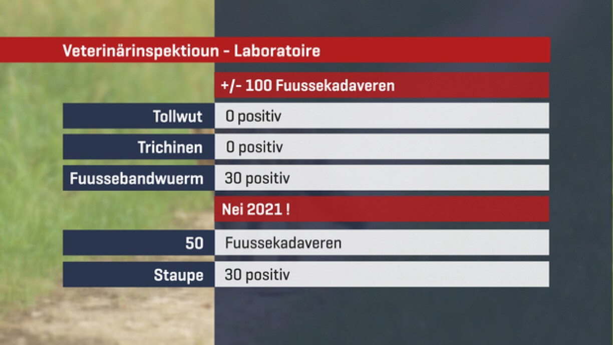 Bei Tollwut an Trichinen gouf et kee positive Fall, dofir haten der 30 vun 100 de Fuussebandwuerm. An eng éischte Kéier hätt een elo och no der Staupe gekuckt. Vu 50 Fiiss waren der 30 positiv, erkläert d’Veterinärsinspektioun. Gewarnt gouf am Mäerz an elo ware 60% Staupe-positiv, obschonns dee Virus seele géif opdauchen, mee wann, da richteg.