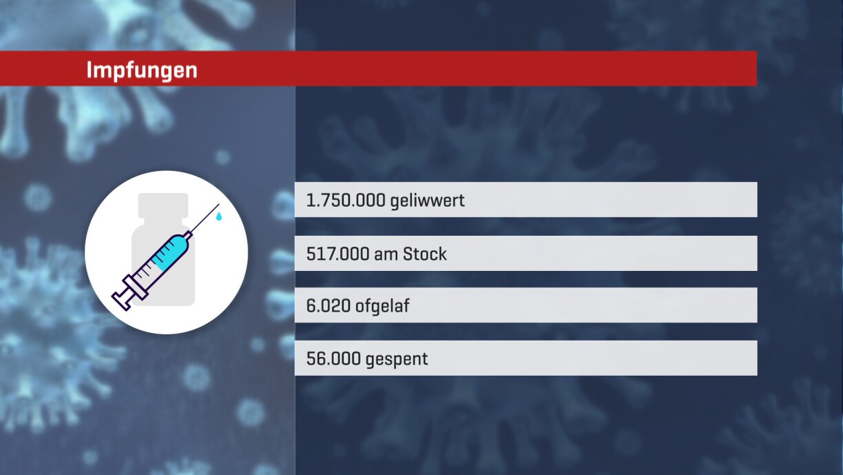 1,75 Milliounen Impfdosisse krut Lëtzebuerg bis elo. Eng hallef Millioun sinn nach am Stock. 6.020 Impfdosissen hu missen zerstéiert ginn, 56.000 goufen un aner Länner gespent.