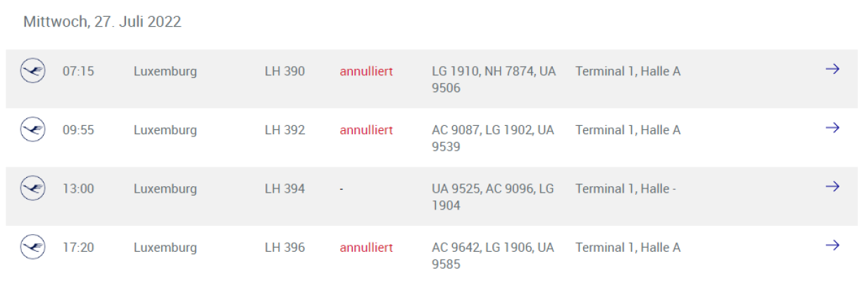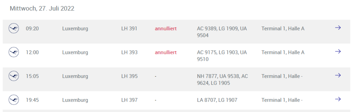 Kuckt een allerdéngs um Site vumFrankfurter Fluchhafen, gesäit een do, dass z.B. de Fluch LH 390 e Mëttwoch um 7h15 vu Frankfurt op Lëtzebuerg annuléiert ass. Och den LH 392 kuerz virun 10 Auer a Richtung Lëtzebuerg ass annuléiert, grad ewéi de Fluch LH 396 vu 17.20 Auer.