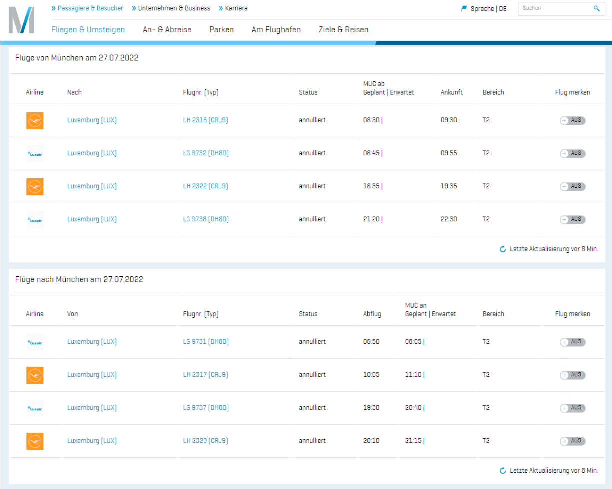 Um Site vum Münchener Fluchhafen kann een dann och liesen, dass 4 Flich op München annuléiert sinn. Et sinn dat: