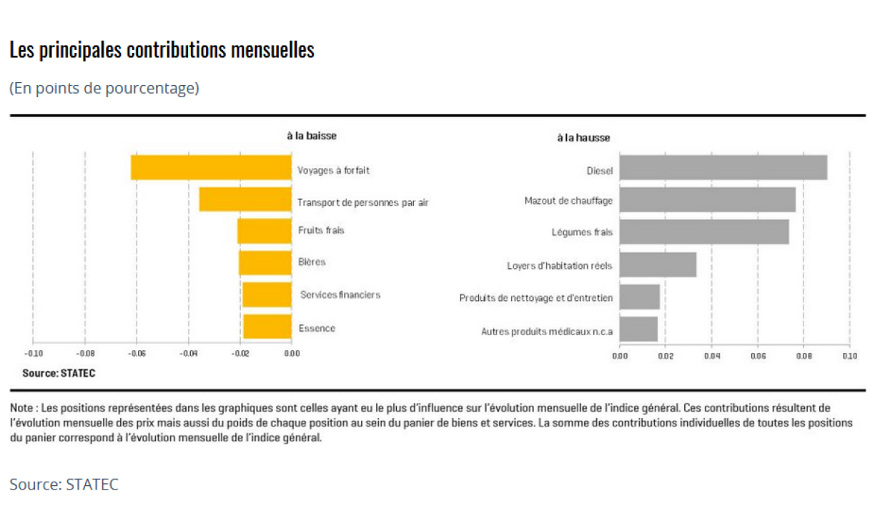 Präisdreiwer waren d’Pëtrolsproduiten, déi bannent engem Mount ëm 2,3 Prozent an d’Luucht gaange sinn. Den Diesel ass souguer 6 Prozent méi deier ginn, de Liter Bensinn ass ëm 1 Prozent erofgaangen, iwwerdeem den Heizungsmasutt ëm 7 Prozent bannent engem Mount zougeluecht huet.