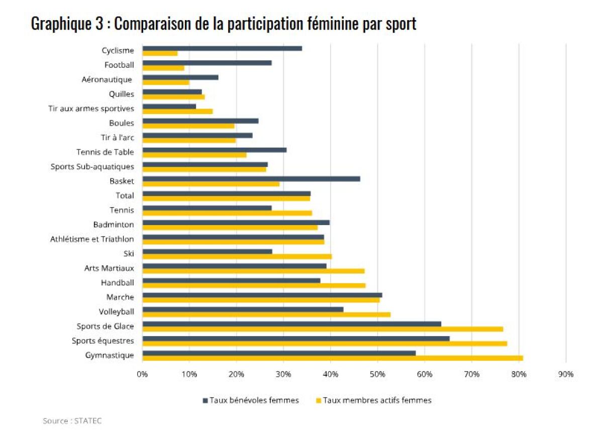 Allerdéngs wiere just 18 Prozent vun deene Poste vu Frae besat. Bei den Trainer ware souguer just 16 Prozent Fraen, bei de Sportler just 15 Prozent. Bei den administrative Poste wiere par konter 48 Prozent vu de Poste vu Frae besat. D’männlech Predominanz am Sport wier dem Statec no doduercher z’erklären, datt déi meescht vun de ronn 77.000 aktive Membere vu Sportsveräiner Männer sinn. Hei si just 36 Prozent Fraen.