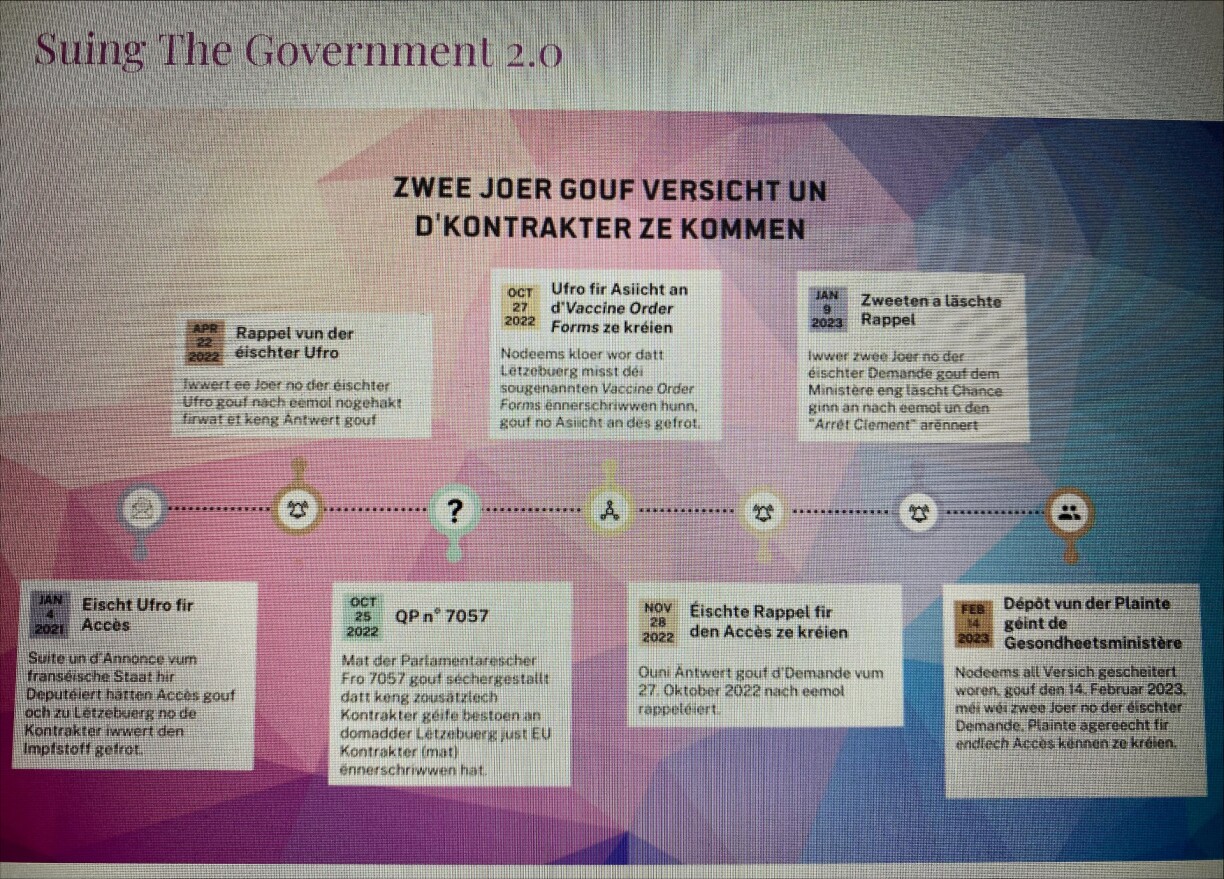 De 14. Februar gouf d’Plainte deposéiert. Ugangs huet et vun der Regierung geheescht, et géinge just europäesch Kontrakter fir d’Liwwerung vun den Impfstoffer ginn an domadder hätt Lëtzebuerg näischt ze dinn. Dat stëmmt net sou ganz, seet de Piraten-Deputéierte Sven Clement. Et géifen Annexe vun deene Kontrakter ginn, eng sougenannten “Vaccine Order Form”, déi all Land eenzel ënnerschriwwen hätt. Doranner wieren ënner anerem d’Präisser, d’Quantitéit an den Datum vun der Liwwerung festgehalen.