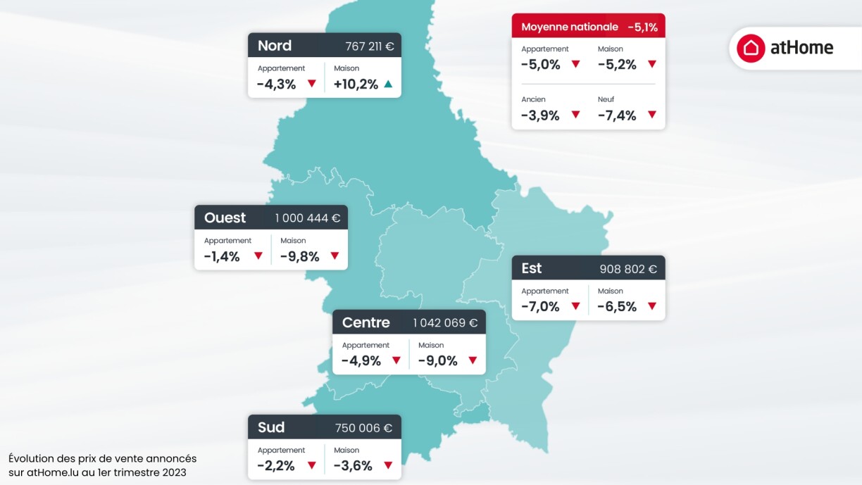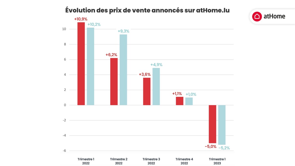 Laang Jore sinn d’Präisser um Lëtzebuerger Immobiliësecteur konstant an d’Luucht gaangen. Ma wéi den Immobilieportal atHome en Dënschdeg matdeelt, sinn d’Präisser fir Haiser an Appartementer am éischten Trimester vum Joer 2023 gefall. Op ee Joer gekuckt wier et eng Baisse vu 5,1 Prozent, 5,2 Prozent bei den Haiser a 5,0 Prozent bei den Appartementer.