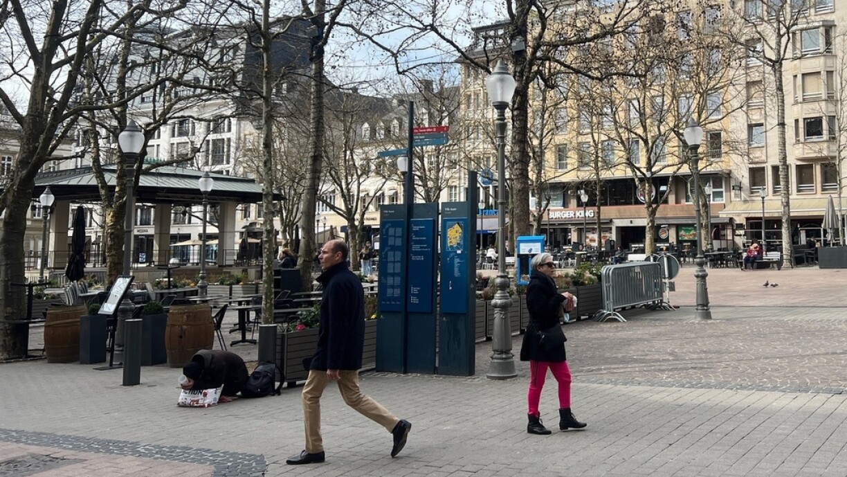 Ech trëppelen a Richtung Place d’Armes. Op mengem Wee begéinen ech schonn déi nächst. Géintiwwer enger Apdikt sëtzt eng jonk Koppel mat zwee Hënn. Si schwätze Lëtzebuergesch, hunn e grousse Rucksak bei sech, eng Hondsschossel mat Waasser fir hir Déieren a sëtzen op enger dënner Ënnerlag. Och si hunn e Kartongsbecher vun enger Fastfood-Chaîne viru sech stoen.