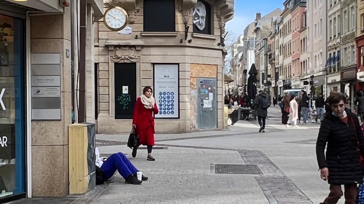 Et ass 14 Auer, ech sinn an der Groussgaass. D’Strooss ass gutt gefëllt. Tëscht Leit, déi grad nom Mëttegiessen zeréck an de Büro lafen, an aneren, déi mat Akafstuten duerch d’Groussgaass schlenderen, sëtzt um Eck vun engem Luxusauere-Geschäft den éischten Heeschert. E Mann, geschat tëscht 30 a 40 Joer al. Hien huet eng déck Jackett un, sëtzt awer nieft sengem Rucksak um kale Buedem. Virun him steet e Kartongsbecher vun enger Fastfood-Chaîne. Ronn eng hallef Stonn observéieren ech dës Situatioun. Sue kritt de Mann wärenddeem keng a säi Becher. Kee schwätzt mat him an och hie schwätzt keen un.