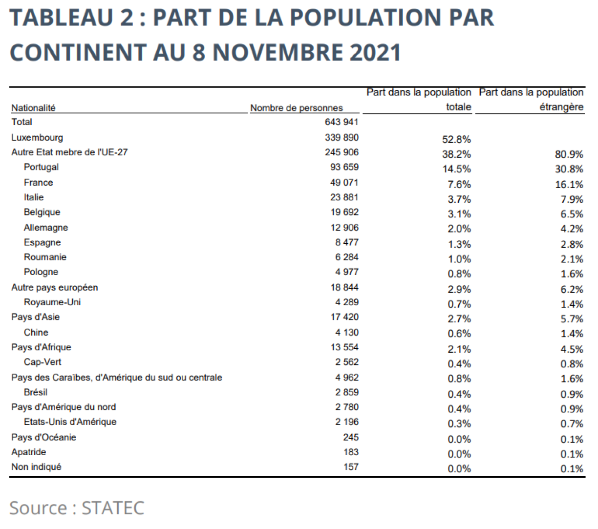 Eng 180 verschidden Nationalitéite sinn zu Lëtzebuerg vertrueden, am meeschte ginn et Portugisen, Fransousen an Italiener. Bei der Evolutioun vun de verschiddene Communautéite gesäit een natierlech den Impakt vu geopoliteschen Entwécklungen a Krisen. 2011 hunn zum Beispill just 25 Syrer an 21 Eriträer zu Lëtzebuerg gelieft, 2021 waren et 2.688 respektiv 1.725. D’Communautéit u Britten op där anerer Säit ass zréckgaangen, wat awer och dorunner léich, datt vill Englänner d’Lëtzebuerger Nationalitéit ugeholl hunn.
